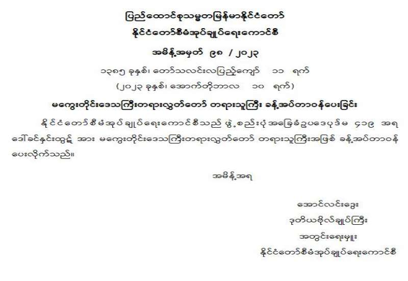 ၂၀၁၄ ခုနှစ်၊ ပုံနှိပ်ခြင်းနှင့်ထုတ်ဝေခြင်းလုပ်ငန်းဥပဒေ၊ နည်းဥပဒေများအရ ထုတ်ဝေသူများသည် မိမိတို့ထုတ်ဝေသည့် စာအုပ်စာစောင် ၅ အုပ် သို့မဟုတ် ၅ စောင်ကို ပြန်ကြားရေးဝန်ကြီးဌာနသို့ အဖိုးအခလွတ်ပေးအပ်ရမည်ဖြစ်ပါသည်။ ပြန်ကြားရေးဝန်ကြီးဌာနသည် အဆိုပါ စာအုပ်စာစောင်များကို မူပိုင်ခွင့်နှင့်စာအုပ်စာရင်း ၂ အုပ်၊ အမျိုးသားစာပေဆုစိစစ်ရွေးချယ်ရေးကော်မတီသို့ ၂ အုပ်နှင့် အမျိုးသား မှတ်တမ်းများမော်ကွန်းတိုက်ဦးစီးဌာနသို့ ၁ အုပ် ပေးပို့လျက်ရှိပါသည်။
