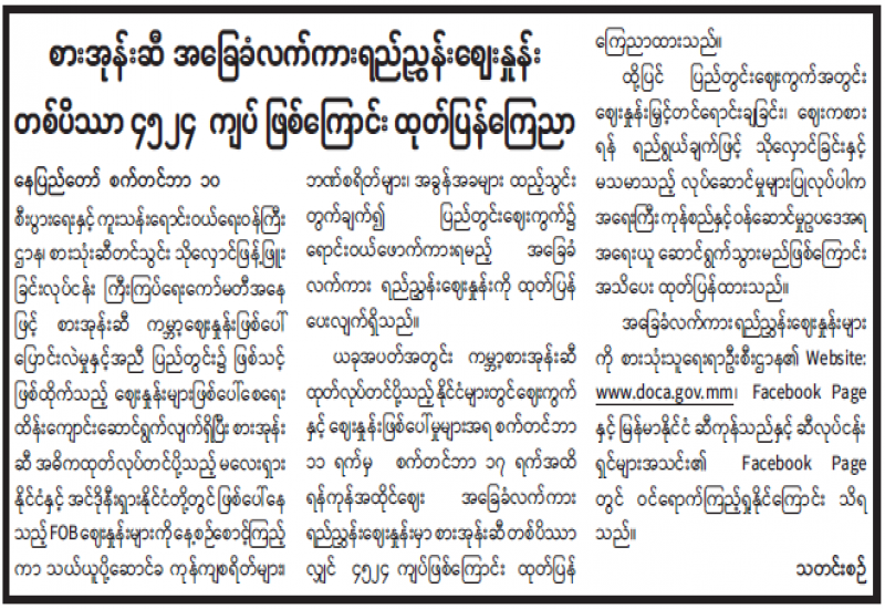 အမေရိကန်အစိုးရ၏ ၂၀၂၃ ခုနှစ် လူကုန်ကူးမှုတိုက်ဖျက်ရေးအစီရင်ခံစာပါ အကြံပြုချက်များနှင့်စပ်လျဉ်း၍ ၂၀၂၃ ခုနှစ်၊ သြဂုတ်လအတွင်း အကောင်အထည်ဖော်ဆောင်ရွက်နေမှုအခြေအနေများနှင့်ပတ်သက်၍ အလုပ်သမားဝန်ကြီးဌာန၏ သတင်းထုတ်ပြန်ချက်တွင် ဖော်ပြထားခြင်းဖြစ်ပါသည်။