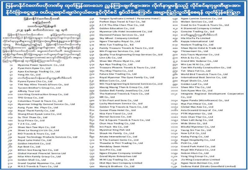 မြန်မာနိုင်ငံတော်ဗဟိုဘဏ်မှ ထုတ်ပြန်ထားသော ညွှန်ကြားချက်များအား လိုက်နာမှုမရှိသည့် လိုင်စင်ရကုမ္ပဏီများအား နိုင်ငံခြားငွေများ ဝယ်ယူရောင်းချလဲလှယ်ပေးခွင့်လိုင်စင် ရုပ်သိမ်းကြောင်း အများပြည်သူသိရှိစေရန် ထုတ်ပြန်ကြေညာ