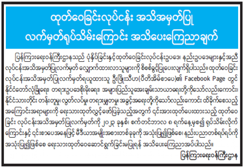 ပြန်ကြားရေးဝန်ကြီးဌာနသည် ပုံနှိပ်ခြင်းနှင့်ထုတ်ဝေခြင်းလုပ်ငန်းဥပဒေ၊ နည်းဥပဒေများနှင့်အညီ လုပ်ငန်းအသိအမှတ်ပြုလက်မှတ် လျှောက်ထားလာသူများကို စိစစ်ခွင့်ပြုပေးလျက်ရှိပါသည်။ ထုတ်ဝေခြင်းလုပ်ငန်း အသိအမှတ်ပြုလက်မှတ်ရယူထားသူ ဦးဖြိုးသီဟ (ပီတိအိမ်စာပေ) ၏ Facebook Page တွင် နိုင်ငံတော်လုံခြုံရေး၊ တရားဥပဒေစိုးမိုးရေး၊ အများပြည်သူ အေးချမ်းသာယာရေးတို့ကိုသော်လည်းကောင်း၊ နိုင်ငံသားတိုင်းတန်းတူမှု၊ လွတ်လပ်မှု၊ တရားမျှတမှု၊ အခွင့်အရေးတို့ကိုသော်လည်းကောင်း ထိခိုက်စေသည့် အကြောင်းအရာများကို ရေးသားထုတ်လွှင့်ဖော်ပြခဲ့သည့်အတွက် ၎င်းအားထုတ်ပေးထားသည့် ထုတ်ဝေခြင်းလုပ်ငန်း အသိအမှတ်ပြုလက်မှတ်ကို ၂၀၂၃ ခုနှစ်၊ စက်တင်ဘာလ ၈ ရက်နေ့မှစ၍ ရုပ်သိမ်းလိုက်ကြောင်းနှင့် ၎င်းစာပေအနေဖြင့် မီဒီယာအမျိုးအစားတစ်ခုခုကို အသုံးပြု၍ဖြစ်စေ၊ နည်းပညာတစ်ရပ်ရပ်ကို အသုံးပြု၍ဖြစ်စေ ရေးသားထုတ်ဝေဆောင်ရွက်ခြင်းမပြုရန် အသိပေးကြေညာအပ်ပါသည်။