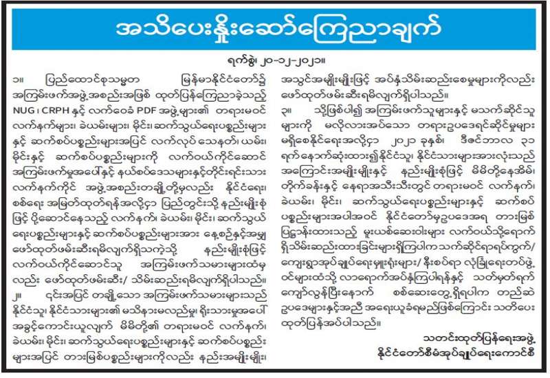 ၁။ ပြည်ထောင်စုသမ္မတမြန်မာနိုင်ငံတော်၌ အကြမ်းဖက်အဖွဲ့ အစည်းအဖြစ် ထုတ်ပြန်ကြေညာ ခဲ့သည့် NUG ၊ CRPH နှင့် လက်ဝေခံ PDF အဖွဲ့များ၏ တရားမဝင် လက်နက်များ၊ ခဲယမ်းများ၊ မိုင်း၊ ဆက်သွယ်ရေးပစ္စည်းများနှင့် ဆက်စပ်ပစ္စည်းများအပြင် လက်လုပ် သေနတ်၊ ယမ်း၊ မိုင်းနှင့် ဆက်စပ်ပစ္စည်းများကို လက်ဝယ်ကိုင်ဆောင် အကြမ်းဖက်မှုအပေါ်နှင့် နယ်စပ်ဒေသများနှင့် တိုင်းရင်းသား လက်နက်ကိုင်အဖွဲ့ အစည်းတချို့တို့မှလည်း နိုင်ငံရေး၊ စစ်ရေး အမြတ်ထုတ်ရန် အလို့ငှာ ပြည်တွင်းသို့ နည်းမျိုးစုံဖြင့် ပို့ဆောင်နေ သည့် လက်နက်၊ ခဲယမ်း၊ မိုင်း၊ ဆက်သွယ်ရေး ပစ္စည်းများနှင့် ဆက်စပ်ပစ္စည်းများအား နေ့စဉ်နှင့်အမျှ ဖော်ထုတ်ဖမ်းဆီးရမိလျက်ရှိသကဲ့ သို့ နည်းမျိုးစုံဖြင့် လက်ဝယ်ကိုင်ဆောင်သူ အကြမ်းဖက်သမားများ ထံမှလည်း ဖော်ထုတ်ဖမ်းဆီး/ သိမ်းဆည်းရမိလျက်ရှိပါသည်။