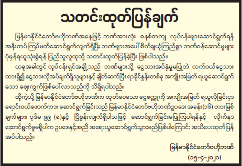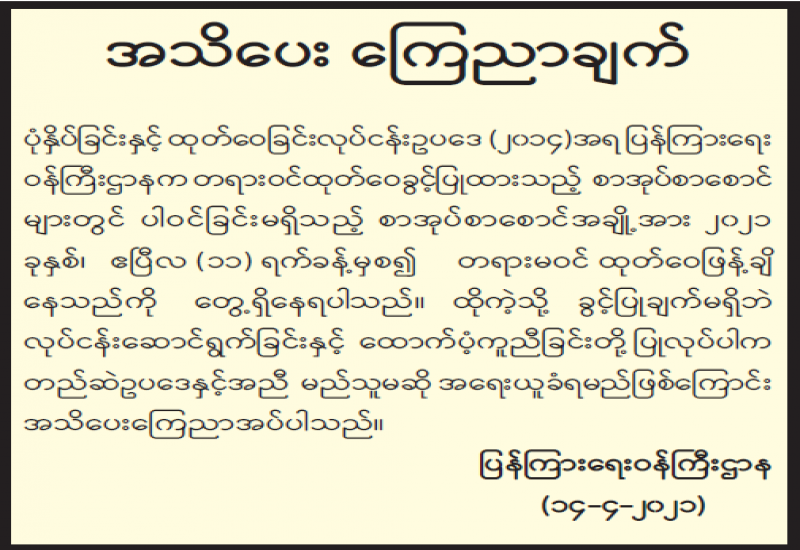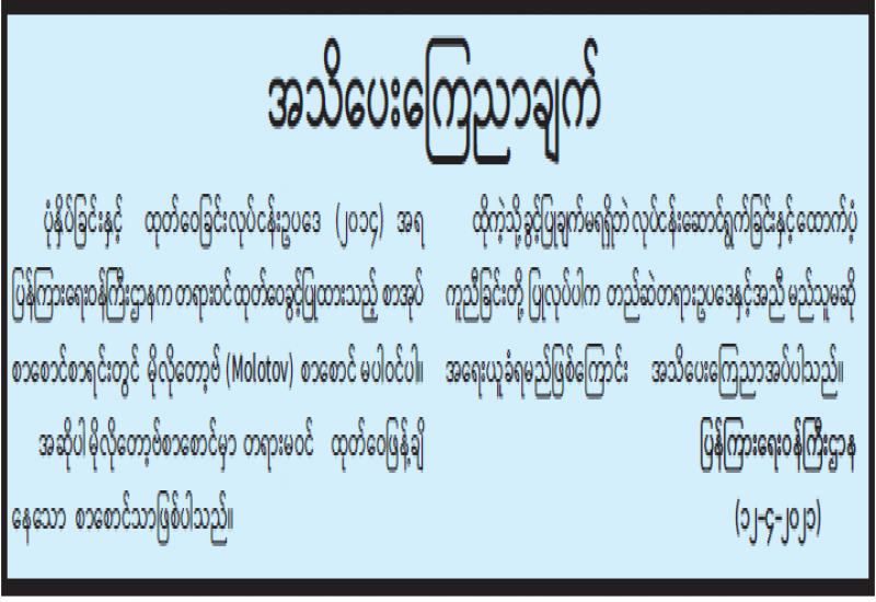 ၁။ တရားမဝင်ဖွဲ့စည်းထားသည့် ပြည်ထောင်စုလွှတ်တော်ကိုယ်စားပြုကော်မတီ (Committee Representing Pyidaungsu Hluttaw-CRPH) နှင့် ယင်းကော်မတီက ဖွဲ့စည်းသော အဖွဲ့အစည်းများကို မတရားအသင်းအဖြစ် ပြည်ထဲရေးဝန်ကြီးဌာန၏ အမိန့်ကြော်ငြာစာအမှတ် (၂/၂၀၂၁) ဖြင့် ၂၀၂၁ ခုနှစ်၊ မတ်လ ၂၁ ရက်နေ့တွင် ထုတ်ပြန်ကြေညာခဲ့ပြီး ဖြစ်ပါသည်။
