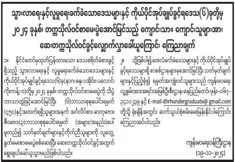 သွားလာရေးနှင့်လူမှုရေးခက်ခဲသောဒေသများနှင့် ကိုယ်ပိုင်အုပ်ချုပ်ခွင့်ရဒေသ(၆)ခုတို့မှ ၂၀၂၄ ခုနှစ်၊ တက္ကသိုလ်ဝင်စာမေးပွဲအောင်မြင်သည့် ကျောင်းသား၊ ကျောင်းသူများအား ဆေးတက္ကသိုလ်ဝင်ခွင့်လျှောက်လွှာခေါ်ယူကြောင်း ကြေညာချက်