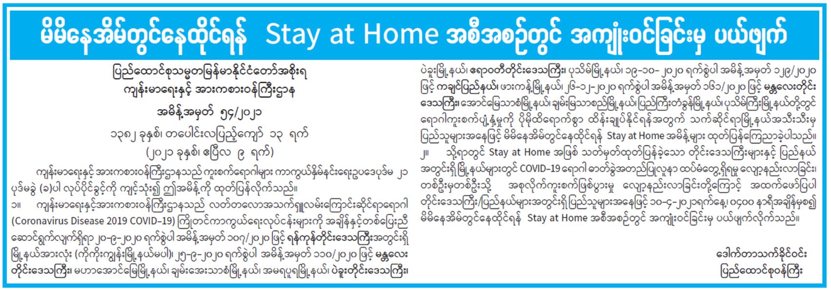 မိမိနေအိမ်တွင်နေထိုင်ရန် Stay at Home အစီအစဉ်တွင် အကျုံးဝင်ခြင်းမှ ပယ်ဖျက်