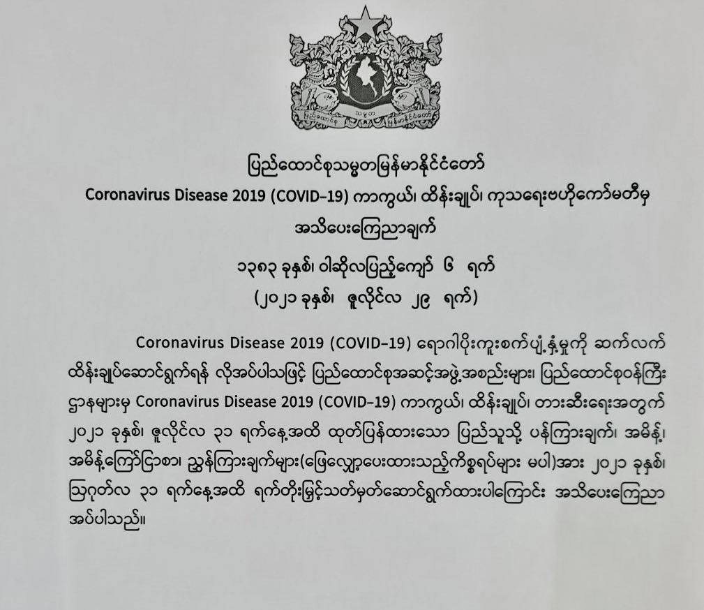 ပြည်သူသို့ ပန်ကြားချက်၊ အမိန့်၊ အမိန့်ကြော်ငြာစာ၊ ညွှန်ကြားချက်များအား သြဂုတ် ၃၁ ရက်အထိ ရက်တိုးမြှင့်သတ်မှတ်