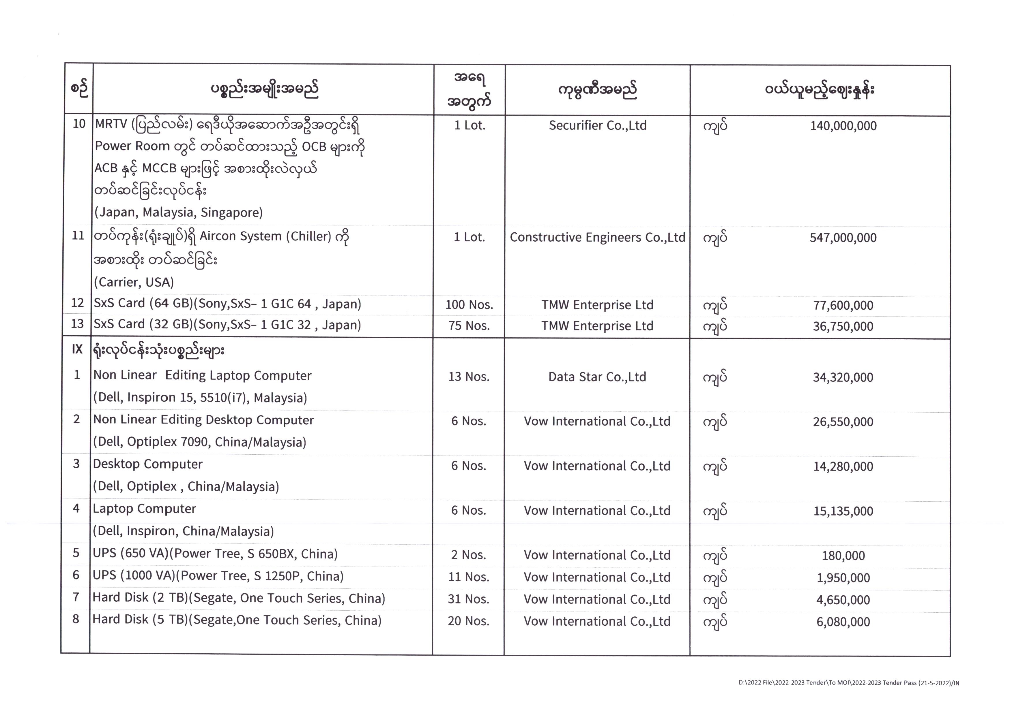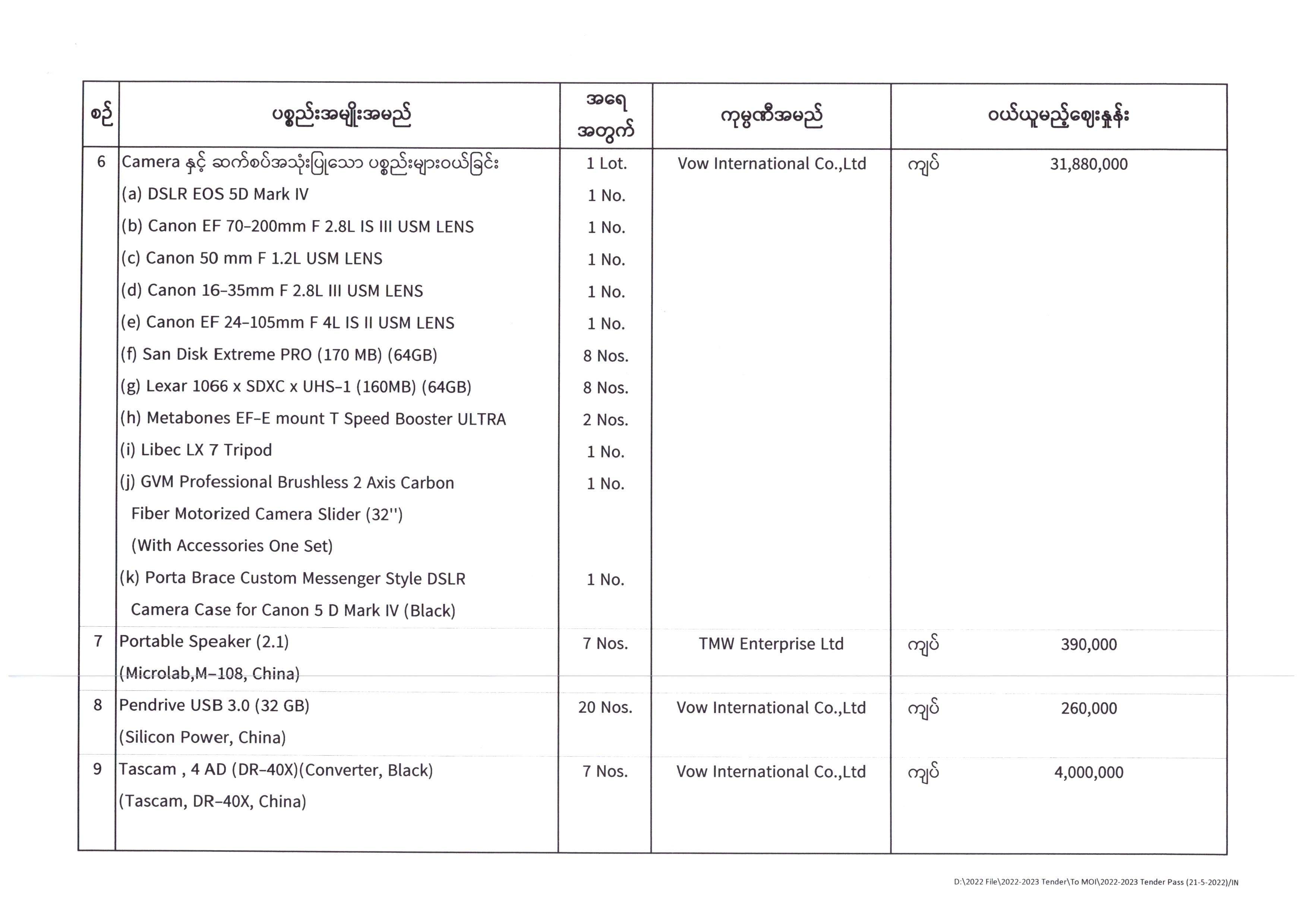 ပြန်ကြားရေးဝန်ကြီးဌာန၊ ပြည်တွင်း/ပြည်ပ ပစ္စည်းများဝယ်ယူရေးနှင့်ထုခွဲရောင်းချရေးကော်မတီအဖွဲ့၊ တင်ဒါအောင်မြင်ကြောင်းကြေညာခြင်း 06/08/2022