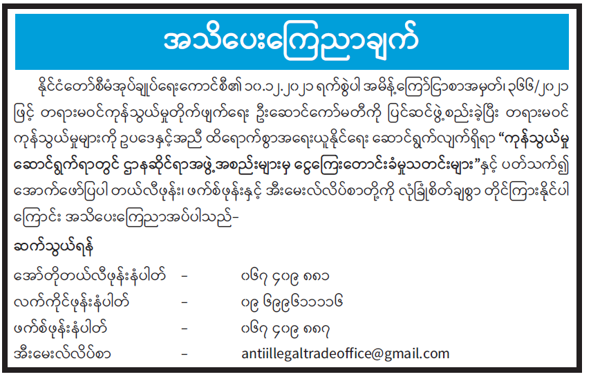 “ကုန်သွယ်မှုဆောင်ရွက်ရာတွင် ဌာနဆိုင်ရာအဖွဲ့အစည်းများမှ ငွေကြေးတောင်းခံမှု သတင်းများ”နှင့်ပတ်သက်၍ အသိပေးကြေညာချက် 10/18/2022