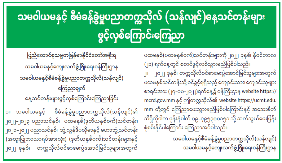 သမဝါယမနှင့်စီမံခန့်ခွဲမှုပညာတက္ကသိုလ် (သန်လျင်)နေ့သင်တန်းများ ဖွင့်လှစ်ကြောင်း ကြေညာ