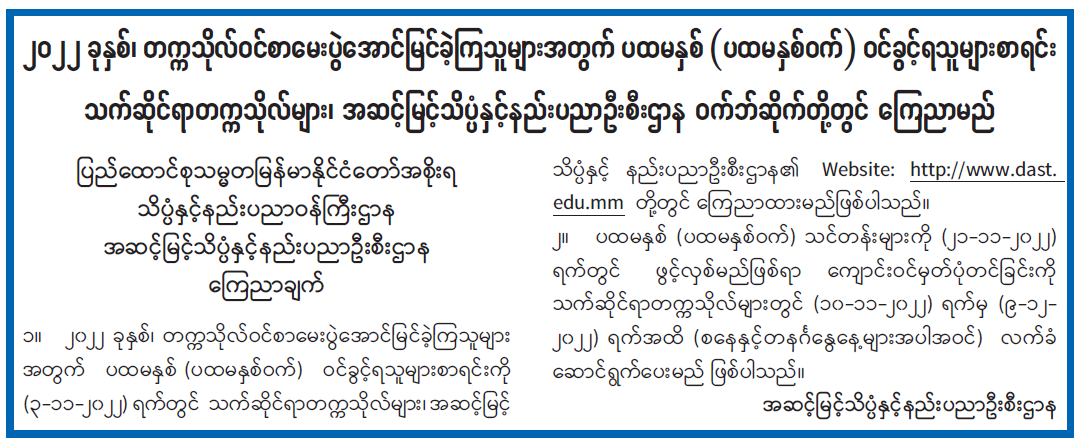 ၂၀၂၂ ခုနှစ်၊ တက္ကသိုလ်ဝင်စာမေးပွဲ အောင်မြင်ခဲ့ကြသူများအတွက် ပထမနှစ်(ပထမနှစ်ဝက်) ဝင်ခွင့်ရသူများစာရင်း သက်ဆိုင်ရာတက္ကသိုလ်များ၊ အဆင့်မြင့်သိပ္ပံနှင့်နည်းပညာဦးစီးဌာန ဝက်ဘ်ဆိုက်တို့တွင် ကြေညာမည်