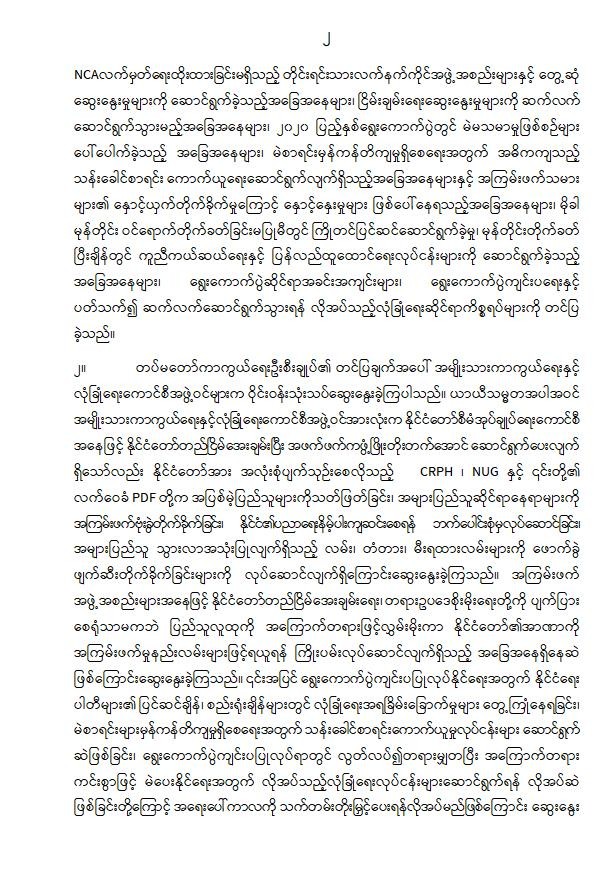 ၂။ တပ်မတော်ကာကွယ်ရေးဦးစီးချုပ်၏ တင်ပြချက်အပေါ် အမျိုးသားကာကွယ်ရေးနှင့် လုံခြုံရေးကောင်စီအဖွဲ့ဝင်များက ဝိုင်းဝန်းသုံးသပ်ဆွေးနွေးခဲ့ကြပါသည်။ ယာယီသမ္မတအပါအဝင် အမျိုးသားကာကွယ်ရေးနှင့် လုံခြုံရေးကောင်စီအဖွဲ့ဝင်အားလုံးက နိုင်ငံတော်စီမံအုပ်ချုပ်ရေးကောင်စီအနေဖြင့် နိုင်ငံတော်တည်ငြိမ်အေးချမ်းပြီး အဖက်ဖက်ကဖွံ့ဖြိုးတိုးတက်အောင် ဆောင်ရွက်ပေးလျက်ရှိသော်လည်း နိုင်ငံတော်အား အလုံးစုံပျက်သုဉ်းစေလိုသည့် CRPH ၊ NUG နှင့် ၎င်းတို့၏ လက်ဝေခံ PDF တို့က အပြစ်မဲ့ပြည်သူများကို သတ်ဖြတ်ခြင်း၊ အများပြည်သူဆိုင်ရာနေရာများကို အကြမ်းဖက်ဗုံးခွဲတိုက်ခိုက်ခြင်း၊ နိုင်ငံ၏ပညာရေး နိမ့်ပါးကျဆင်းစေရန် ဘက်ပေါင်းစုံမှလုပ်ဆောင်ခြင်း၊ အများပြည်သူ သွားလာအသုံးပြုလျက်ရှိသည့် လမ်း၊ တံတား၊ မီးရထားလမ်းများကို ဖောက်ခွဲဖျက်ဆီးတိုက်ခိုက်ခြင်းများကို လုပ်ဆောင်လျက်ရှိကြောင်း ဆွေးနွေးခဲ့ကြသည်။ အကြမ်းဖက် အဖွဲ့အစည်းများအနေဖြင့် နိုင်ငံတော်တည်ငြိမ်အေးချမ်းရေး၊ တရားဥပဒေစိုးမိုးရေးတို့ကို ပျက်ပြားစေရုံသာမကဘဲ ပြည်သူလူထုကို အကြောက်တရားဖြင့်လွှမ်းမိုးကာ နိုင်ငံတော်၏အာဏာကို အကြမ်းဖက်မှုနည်းလမ်းများဖြင့်ရယူရန် ကြိုးပမ်းလုပ်ဆောင်လျက်ရှိသည့် အခြေအနေရှိနေဆဲ ဖြစ်ကြောင်းဆွေးနွေးခဲ့ကြသည်။ ၎င်းအပြင် ရွေးကောက်ပွဲ ကျင်းပပြုလုပ်နိုင်ရေးအတွက် နိုင်ငံရေးပါတီများ၏ ပြင်ဆင်ချိန်၊ စည်းရုံးချိန်များတွင် လုံခြုံရေးအရခြိမ်းခြောက်မှုများ တွေ့ကြုံနေရခြင်း၊ မဲစာရင်းများမှန်ကန်တိကျမှုရှိစေရေးအတွက် သန်းခေါင်စာရင်းကောက်ယူမှုလုပ်ငန်းများ ဆောင်ရွက် ဆဲဖြစ်ခြင်း၊ ရွေးကောက်ပွဲကျင်းပပြုလုပ်ရာတွင် လွတ်လပ်၍တရားမျှတပြီး အကြောက်တရားကင်းစွာဖြင့် မဲပေးနိုင်ရေးအတွက် လိုအပ်သည့်လုံခြုံရေးလုပ်ငန်းများ ဆောင်ရွက်ရန် လိုအပ်ဆဲဖြစ်ခြင်းတို့ကြောင့် အရေးပေါ်ကာလကို သက်တမ်းတိုးမြှင့်ပေးရန်လိုအပ်မည်ဖြစ်ကြောင်း ဆွေးနွေးခဲ့ကြသည်။ ဆွေးနွေးချက်၊ ဆုံးဖြတ်ချက်များအရ တပ်မတော်ကာကွယ်ရေးဦးစီးချုပ်က လုပ်ငန်းတာဝန်များပြီးမြောက်အောင် ဆောင်ရွက်နိုင်ရန်အတွက် ပြည်ထောင်စုသမ္မတမြန်မာနိုင်ငံတော် ဖွဲ့စည်းပုံအခြေခံဥပဒေပုဒ်မ ၄၂၅ အရလည်းကောင်း၊ ၂၀၂၃ ခုနှစ်၊ ဖေဖော်ဝါရီ ၁ ရက်နေ့တွင် ထုတ်ပြန်ခဲ့သည့် နိုင်ငံတော်ဖွဲ့စည်းပုံအခြေခံဥပဒေဆိုင်ရာခုံရုံး၏ သဘောထားထုတ်ပြန်ချက်အရ လည်းကောင်း နိုင်ငံတစ်ဝန်းလုံး အရေးပေါ်အခြေအနေကြေညာထားသည့်ကာလအား ၂၀၂၃ ခုနှစ် ဩဂုတ်လ ၁ ရက်နေ့မှစ၍ နောက်ထပ် (၆) လ သက်တမ်းတိုးမြှင့်လိုက်သည်။