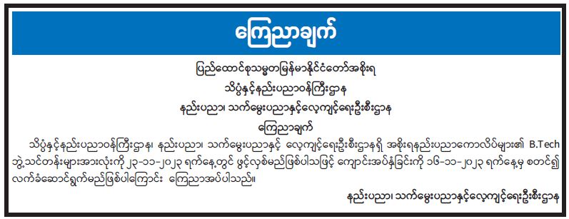 အစိုးရနည်းပညာကောလိပ်များ၏ B.Tech ဘွဲ့သင်တန်းသားများ ကျောင်းအပ်နှံရေးရက်သတ်မှတ်ခြင်း