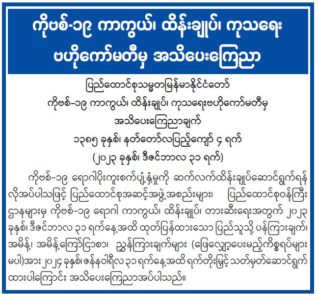 ကိုဗစ်-၁၉ ရောဂါပိုးကူးစက်ပျံ့နှံ့မှုကို ဆက်လက်ထိန်းချုပ်ဆောင်ရွက်ရန် လိုအပ်ပါသဖြင့် ပြည်ထောင်စုအဆင့်အဖွဲ့အစည်းများ၊ ပြည်ထောင်စုဝန်ကြီးဌာနများမှ ကိုဗစ်-၁၉ ရောဂါ ကာကွယ်၊ ထိန်းချုပ်၊ တားဆီးရေးအတွက် ၂၀၂၃ ခုနှစ်၊ ဒီဇင်ဘာလ ၃၁ ရက်နေ့အထိ ထုတ်ပြန်ထားသော ပြည်သူသို့ ပန်ကြားချက်၊ အမိန့်၊ အမိန့်ကြော်ငြာစာ၊ ညွှန်ကြားချက်များ (ဖြေလျှော့ပေးမည့်ကိစ္စရပ်များမပါ) အား ၂၀၂၄ ခုနှစ်၊ ဇန်နဝါရီလ ၃၁ ရက်နေ့အထိ ရက်တိုးမြှင့် သတ်မှတ်ဆောင်ရွက်ထားပါကြောင်း အသိပေးကြေညာအပ်ပါသည်။