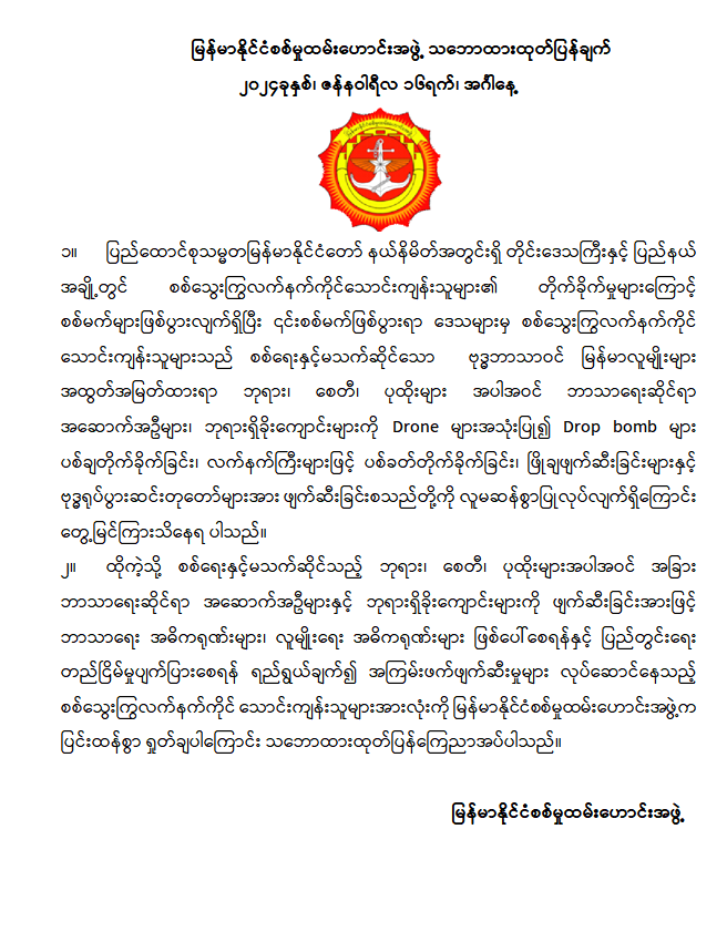 ၁။ ပြည်ထောင်စုသမ္မတမြန်မာနိုင်ငံတော် နယ်နိမိတ်အတွင်းရှိ တိုင်းဒေသကြီးနှင့် ပြည်နယ်အချို့တွင် စစ်သွေးကြွလက်နက်ကိုင်သောင်းကျန်းသူများ၏ တိုက်ခိုက်မှု များကြောင့် စစ်မက်များဖြစ်ပွားလျက်ရှိပြီး ၎င်းစစ်မက်ဖြစ်ပွားရာ ဒေသများမှ စစ်သွေးကြွလက်နက်ကိုင်သောင်းကျန်းသူများသည် စစ်ရေးနှင့်မသက်ဆိုင်သော ဗုဒ္ဓဘာသာဝင် မြန်မာလူမျိုးများ အထွတ်အမြတ်ထားရာ ဘုရား၊ စေတီ၊ ပုထိုးများအပါအဝင် ဘာသာရေးဆိုင်ရာ အဆောက်အဦများ၊ ဘုရားရှိခိုးကျောင်းများကို Drone များအသုံးပြု၍ Drop bomb များ ပစ်ချတိုက်ခိုက်ခြင်း၊ လက်နက်ကြီးများဖြင့် ပစ်ခတ်တိုက်ခိုက်ခြင်း၊ ဖြိုချဖျက်ဆီးခြင်းများနှင့် ဗုဒ္ဓရုပ်ပွားဆင်းတုတော်များအား ဖျက်ဆီးခြင်းစသည်တို့ကို လူမဆန်စွာပြုလုပ်လျက်ရှိကြောင်း တွေ့မြင်ကြားသိနေရ ပါသည်။
