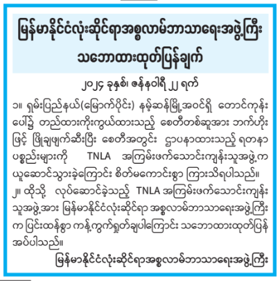 ၂။ ထိုသို့ လုပ်ဆောင်ခဲ့သည့် TNLA အကြမ်းဖက်သောင်းကျန်း သူအဖွဲ့အား မြန်မာနိုင်ငံလုံးဆိုင်ရာ အစ္စလာမ်ဘာသာရေးအဖွဲ့ကြီးက ပြင်းထန်စွာကန့်ကွက်ရှုတ်ချပါကြောင်း သဘောထားထုတ်ပြန် အပ်ပါသည်။