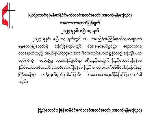 ပြည်ထောင်စုမြန်မာနိုင်ငံ မက်သဒစ်အသင်းတော် (အောက်မြန်မာပြည်) သဘောထားထုတ်ပြန်ချက်