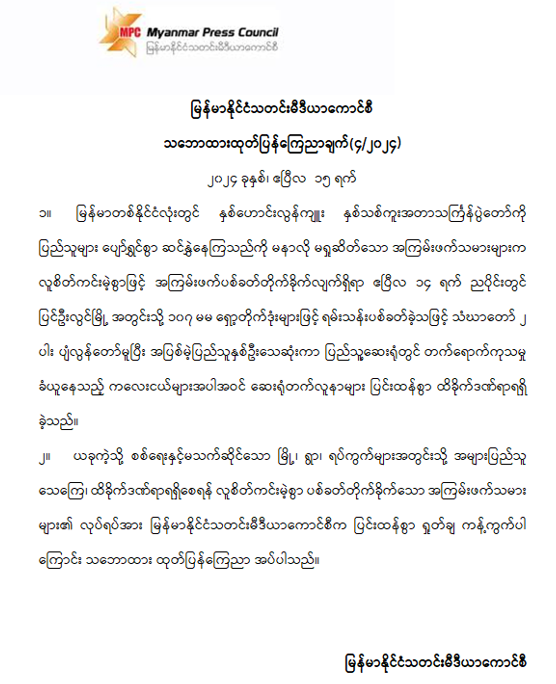 မြန်မာနိုင်ငံသတင်းမီဒီယာကောင်စီ သဘောထားထုတ်ပြန်ကြေညာချက် (၄/၂၀၂၄)