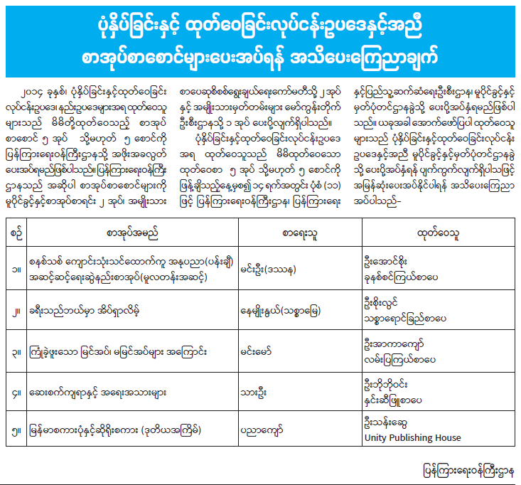 ပုံနှိပ်ခြင်းနှင့် ထုတ်ဝေခြင်းလုပ်ငန်းဥပဒေနှင့်အညီ စာအုပ်စာစောင်များပေးအပ်ရန် အသိပေးကြေညာချက် 04/27/2024