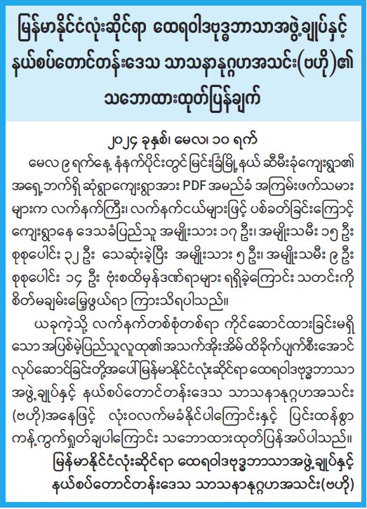 ယခုကဲ့သို့ လက်နက်တစ်စုံတစ်ရာ ကိုင်ဆောင်ထားခြင်းမရှိ သော အပြစ်မဲ့ပြည်သူလူထု၏ အသက်အိုးအိမ် ထိခိုက်ပျက်စီးအောင် လုပ်ဆောင်ခြင်းတို့အပေါ် မြန်မာနိုင်ငံလုံးဆိုင်ရာ ထေရဝါဒဗုဒ္ဓဘာသာ အဖွဲ့ချုပ်နှင့် နယ်စပ်တောင်တန်းဒေသ သာသနာနုဂ္ဂဟအသင်း (ဗဟို)အနေဖြင့် လုံးဝလက်မခံနိုင်ပါကြောင်းနှင့် ပြင်းထန်စွာ ကန့်ကွက်ရှုတ်ချပါကြောင်း သဘောထားထုတ်ပြန်အပ်ပါသည်။