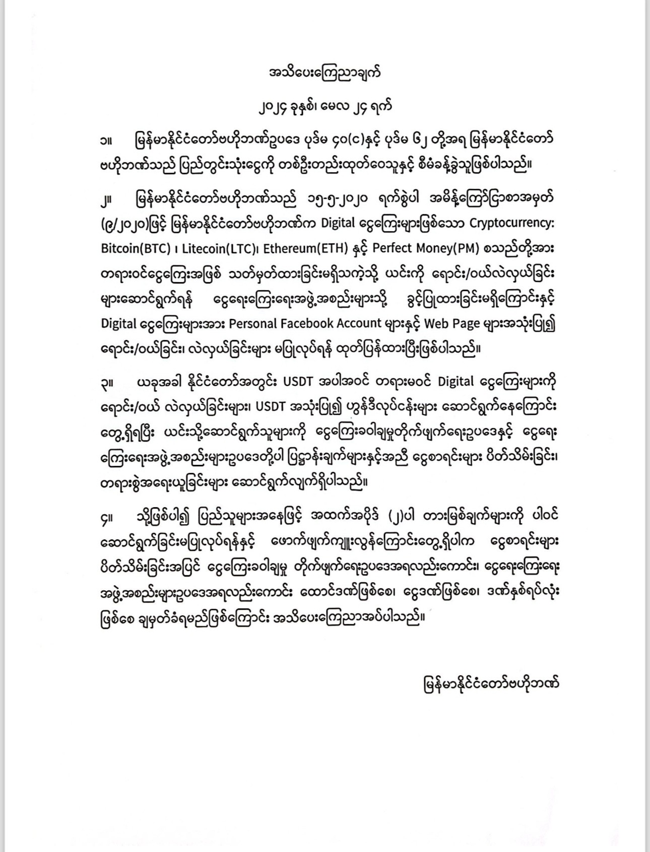 ၂။ မြန်မာနိုင်ငံတော်ဗဟိုဘဏ်သည် ၁၅-၅-၂၀၂၀ ရက်စွဲပါ အမိန့်ကြော်ငြာစာအမှတ် (၉/၂၀၂၀)ဖြင့် မြန်မာနိုင်ငံတော်ဗဟိုဘဏ်က Digital ငွေကြေးများဖြစ်သော Cryptocurrency: Bitcoin(BTC) ၊ Litecoin(LTC)၊ Ethereum(ETH) နှင့် Perfect Money(PM) စသည်တို့အား တရားဝင်ငွေကြေးအဖြစ် သတ်မှတ်ထားခြင်းမရှိသကဲ့သို့ ယင်းကို ရောင်း/ဝယ်လဲလှယ်ခြင်း များဆောင်ရွက်ရန် ငွေရေးကြေးရေးအဖွဲ့အစည်းများသို့ ခွင့်ပြုထားခြင်းမရှိကြောင်းနှင့် Digital ငွေကြေးများအား Personal Facebook Account များနှင့် Web Page များအသုံးပြု၍ ရောင်း/ဝယ်ခြင်း၊ လဲလှယ်ခြင်းများ မပြုလုပ်ရန် ထုတ်ပြန်ထားပြီးဖြစ်ပါသည်။