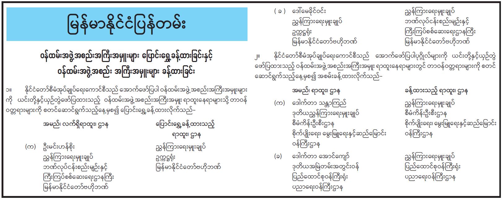ဝန်ထမ်းအဖွဲ့အစည်းအကြီးအမှူးများ ပြောင်းရွှေ့ခန့်ထားခြင်းနှင့် ဝန်ထမ်းအဖွဲ့အစည်း အကြီးအမှူး များ ခန့်ထားခြင်း 01/15/2025