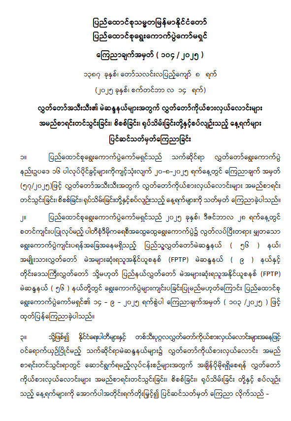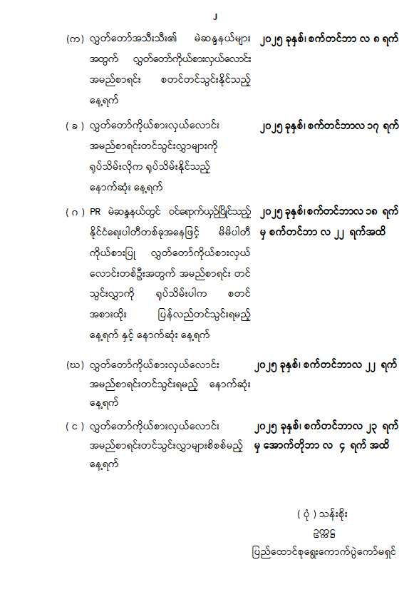 လွှတ်တော်အသီးသီး၏ မဲဆန္ဒနယ်များအတွက် လွှတ်တော်ကိုယ်စားလှယ်လောင်းများ အမည်စာရင်းတင်သွင်းခြင်း၊ စိစစ်ခြင်း၊ ရုပ်သိမ်းခြင်းတို့နှင့်စပ်လျဉ်းသည့် နေ့ရက်များ ပြင်ဆင်သတ်မှတ်ကြေညာ