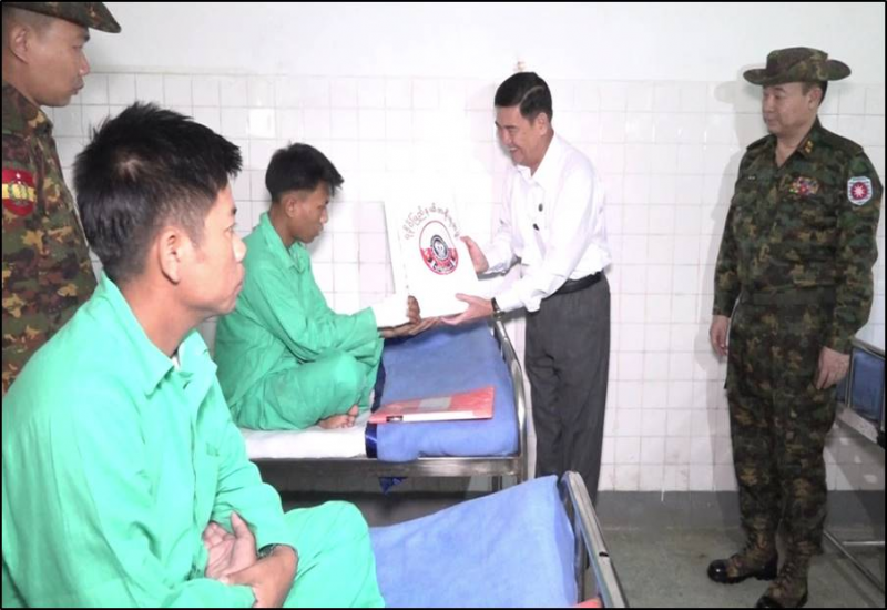 ရခိုင်ပြည်နယ်၊ စစ်တွေမြို့ရှိ တပ်မတော်ဆေးရုံ၌ တက်ရောက်ဆေးကုသမှု ခံယူလျက်ရှိသော အရာရှိ၊ စစ်သည်များနှင့် မိသားစုဝင်များအား ယနေ့နံနက်ပိုင်းတွင် ပြည်နယ်ဝန်ကြီးချုပ် ဦးထိန်လင်း၊ အနောက်ပိုင်းတိုင်းစစ်ဌာနချုပ်တိုင်းမှူး ဗိုလ်ချုပ်ကျော်စွာဦး၊ ပြည်နယ်ဝန်ကြီးများနှင့် မြန်မာနိုင်ငံရဲတပ်ဖွဲ့မှ တာဝန်ရှိသူများက သွားရောက်ကြည့်ရှု၍ တစ်ဦးချင်း၏ရောဂါဖြစ်ပွားမှုများ၊ ဆေးဝါးကုသပေးထားမှုနှင့် ကျန်းမာရေးတိုးတက်ကောင်းမွန်မှုအခြေအနေများကို ရင်းရင်းနှီးနှီးမေးမြန်း အားပေးစကားပြောကြားပြီး အာဟာရဖြည့်စားသောက်ဖွယ်ရာများ ပေးအပ်သည်။