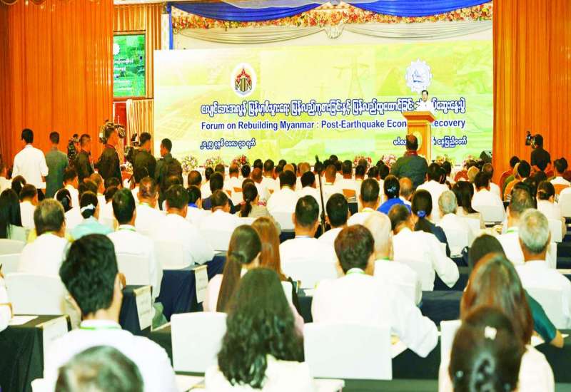 ငလျင်ဘေးအလွန် မြန်မာ့စီးပွားရေးပြန်လည်ကုစားခြင်းနှင့် ပြန်လည်ထူထောင်ခြင်း သုံးသပ်ဆွေးနွေးပွဲ (Rebuilding Myanmar : Post Earthquake Economic Recovery) ဖွင့်ပွဲအခမ်းအနားကို ယနေ့နံနက်ပိုင်းတွင် နေပြည်တော်ရှိ မင်္ဂလာသီရိဟိုတယ်၌ ကျင်းပပြုလုပ်ရာ နိုင်ငံတော်စီမံအုပ်ချုပ်ရေးကောင်စီဥက္ကဋ္ဌ နိုင်ငံတော်ဝန်ကြီးချုပ် ဗိုလ်ချုပ်မှူးကြီး မင်းအောင်လှိုင်တက်ရောက်၍ အဖွင့်အမှာစကားပြောကြားသည်။