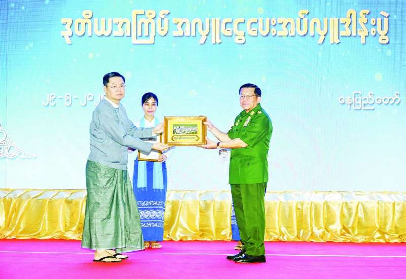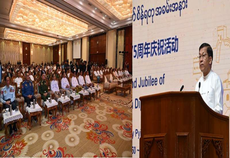 မြန်မာ - တရုတ် နှစ်နိုင်ငံသံတမန်ဆက်ဆံရေးထူထောင်မှု (၇၅) နှစ်မြောက် စိန်ရတုအထိမ်းအမှတ်အခမ်းအနားကို ယနေ့နံနက်ပိုင်းတွင် နေပြည်တော်ရှိ မင်္ဂလာသီရိဟိုတယ်၌ ကျင်းပပြုလုပ်ရာ နိုင်ငံတော်စီမံအုပ်ချုပ်ရေးကောင်စီဥက္ကဋ္ဌ နိုင်ငံတော်ဝန်ကြီးချုပ် ဗိုလ်ချုပ်မှူးကြီး မင်းအောင်လှိုင် တက်ရောက်၍ အမှာစကားပြောကြားသည်။