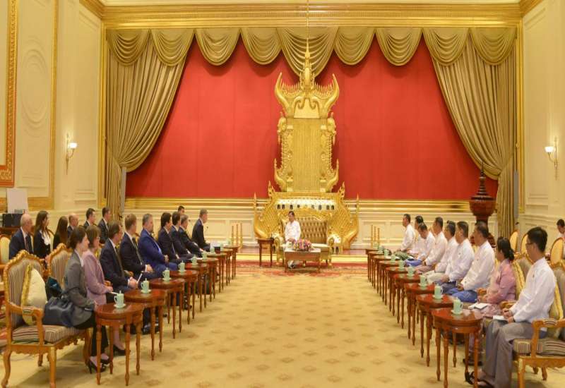 ရုရှားဖက်ဒရေးရှင်းနိုင်ငံသို့ တရားဝင်ချစ်ကြည်ရေးခရီးရောက်ရှိနေသည့် နိုင်ငံတော်စီမံအုပ်ချုပ်ရေးကောင်စီဥက္ကဋ္ဌ နိုင်ငံတော်ဝန်ကြီးချုပ် ဗိုလ်ချုပ်မှူးကြီးမင်းအောင်လှိုင်သည် မတ် ၄ ရက်နေ့ညပိုင်းတွင် ရုရှား-အာဆီယံစီးပွားရေးကော်မရှင်ဥက္ကဋ္ဌ Mr. Ivan Polyakov ဦးဆောင်သည့်အဖွဲ့အား မော်စကိုမြို့၊ Radisson Collection ဟိုတယ်ရှိ အစည်းအဝေးခန်းမ၌ လက်ခံတွေ့ဆုံသည်။