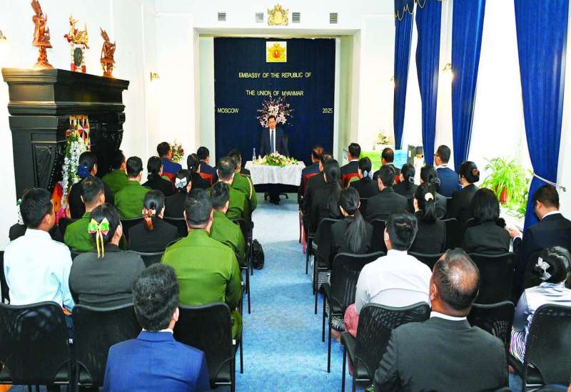 ရုရှားဖက်ဒရေးရှင်းနိုင်ငံ၊ မော်စကိုမြို့တွင် တရားဝင်ချစ်ကြည်ရေးခရီးရောက်ရှိနေသည့် နိုင်ငံတော်စီမံအုပ်ချုပ်ရေးကောင်စီဥက္ကဋ္ဌ နိုင်ငံတော်ဝန်ကြီးချုပ် ဗိုလ်ချုပ်မှူးကြီးမင်းအောင်လှိုင်သည် ရုရှားဖက်ဒရေးရှင်းနိုင်ငံဆိုင်ရာ မြန်မာသံရုံးနှင့် စစ်သံရုံးမိသားစုများအား ဒေသစံတော်ချိန် ယနေ့နံနက်ပိုင်းတွင် ရုရှားဖက်ဒရေးရှင်းနိုင်ငံဆိုင်ရာ မြန်မာသံရုံး၌ တွေ့ဆုံအမှာစကားပြောကြားသည်။