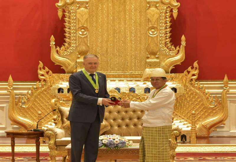 နိုင်ငံတော်စီမံအုပ်ချုပ်ရေးကောင်စီဥက္ကဋ္ဌ နိုင်ငံတော်ဝန်ကြီးချုပ် ဗိုလ်ချုပ်မှူးကြီးသတိုးမဟာသရေစည်သူ သတိုးသီရိသုဓမ္မမင်းအောင်လှိုင်သည် မြန်မာနိုင်ငံနှင့် ရုရှားနိုင်ငံတို့အကြား ချစ်ကြည်ရင်းနှီးမှုနှင့် ပူးပေါင်းဆောင်ရွက်မှုများ ပိုမိုနီးကပ်ခိုင်မာအောင် စွမ်းစွမ်းတမံတည်ဆောက်နိုင်ခဲ့သည့် မြန်မာနိုင်ငံဆိုင်ရာ ရုရှားနိုင်ငံ သံအမတ်ကြီး H. E. Dr. Nikolay LISTOPADOV အား စွမ်းဆောင်မှုဆိုင်ရာ ဂုဏ်ထူးဆောင်ဘွဲ့၊ ဝဏ္ဏကျော်ထင်ဘွဲ့ ချီးမြှင့်အပ်နှင်းခြင်းအနားကို ယနေ့နံနက်ပိုင်းတွင် နေပြည်တော်ရှိ နိုင်ငံတော်စီမံအုပ်ချုပ်ရေးကောင်စီဥက္ကဋ္ဌရုံး သံတမန်ဆောင်ဧည့်ခန်းမ၌ ကျင်းပပြုလုပ်သည်။