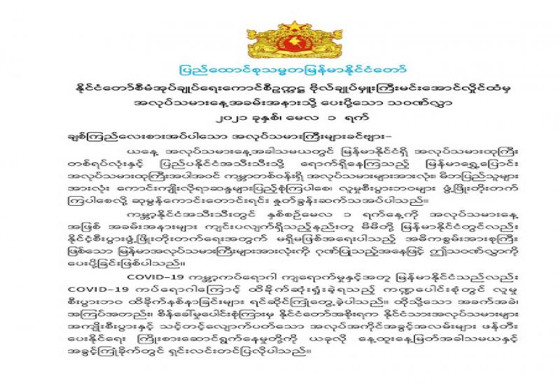 မြန်မာနိုင်ငံ ကလေးအလုပ်သမားပပျောက်ရေးဆိုင်ရာ အမျိုးသားကော်မတီ စတုတ္ထအကြိမ် လုပ်ငန်းညှိနှိုင်းအစည်းအဝေးကို ယနေ့မွန်းလွဲ ၂ နာရီတွင် နိုင်ငံတော်စီမံအုပ်ချုပ်ရေး ကောင်စီရုံး၌ Zoom Meeting ဖြင့်ကျင်းပရာ မြန်မာနိုင်ငံကလေး အလုပ်သမားပပျောက်ရေးဆိုင်ရာ အမျိုးသားကော်မတီဥက္ကဋ္ဌ၊ နိုင်ငံတော်စီမံအုပ်ချုပ်ရေးကောင်စီ ဒုတိယဥက္ကဋ္ဌ၊ ဒုတိယ တပ်မတော်ကာကွယ်ရေးဦးစီးချုပ် ကာကွယ်ရေးဦးစီးချုပ်(ကြည်း)၊ ဒုတိယဗိုလ်ချုပ်မှူးကြီး စိုးဝင်း တက်ရောက်အမှာစကား ပြောကြားသည်။