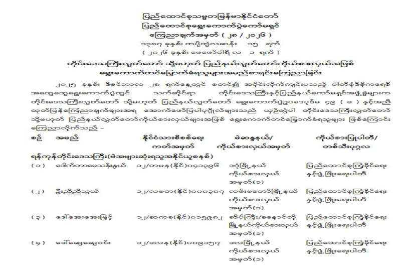 တိုင်းဒေသကြီးလွှတ်တော် သို့မဟုတ် ပြည်နယ်လွှတ်တော်ကိုယ်စားလှယ်အဖြစ် ရွေးကောက်တင်မြှောက်ခံရသူများ အမည်စာရင်းကြေညာခြင်း
