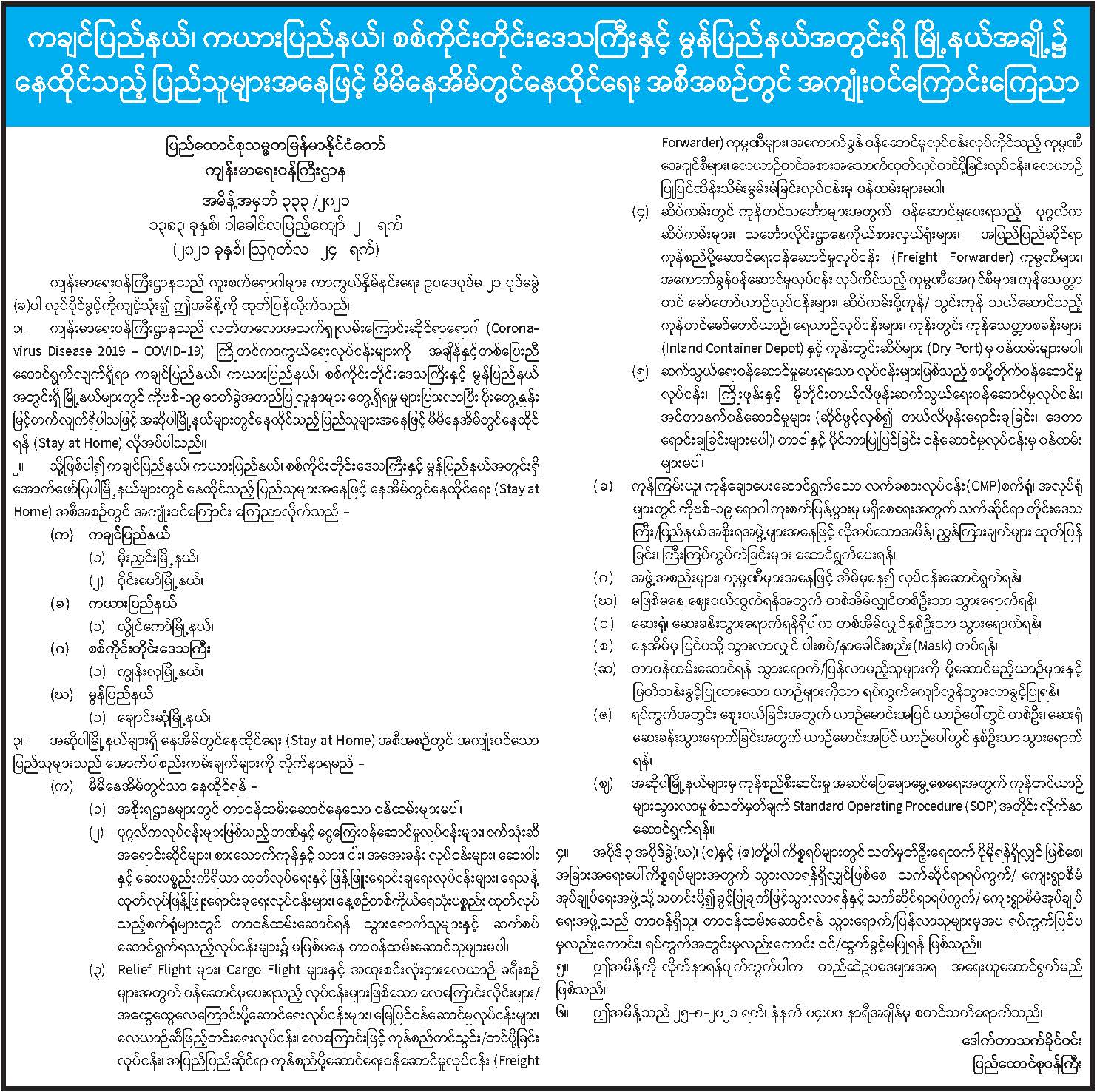 ကချင်ပြည်နယ်၊ ကယားပြည်နယ်၊ စစ်ကိုင်းတိုင်းဒေသကြီးနှင့် မွန်ပြည်နယ်အတွင်းရှိ မြို့နယ်အချို့၌ နေထိုင်သည့် ပြည်သူများအနေဖြင့် မိမိနေအိမ်တွင် နေထိုင်ရေး အစီအစဉ်တွင် အကျုံးဝင်ကြောင်း ကြေညာ 08/25/2021