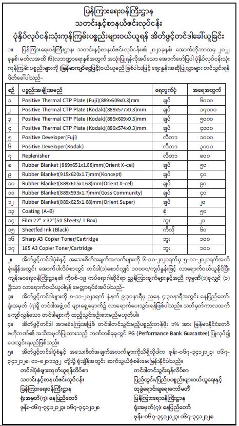ပြန်ကြားရေးဝန်ကြီးဌာန သတင်းနှင့်စာနယ်ဇင်းလုပ်ငန်း ပုံနှိပ်လုပ်ငန်းသုံးကုန်ကြမ်းပစ္စည်းများဝယ်ယူရန် အိတ်ဖွင့်တင်ဒါခေါ်ယူခြင်း 10/07/2021 ပြန်ကြားရေးဝန်ကြီးဌာန သတင်းနှင့်စာနယ်ဇင်းလုပ်ငန်း ပုံနှိပ်လုပ်ငန်းသုံးကုန်ကြမ်းပစ္စည်းများဝယ်ယူရန် အိတ်ဖွင့်တင်ဒါခေါ်ယူခြင်း