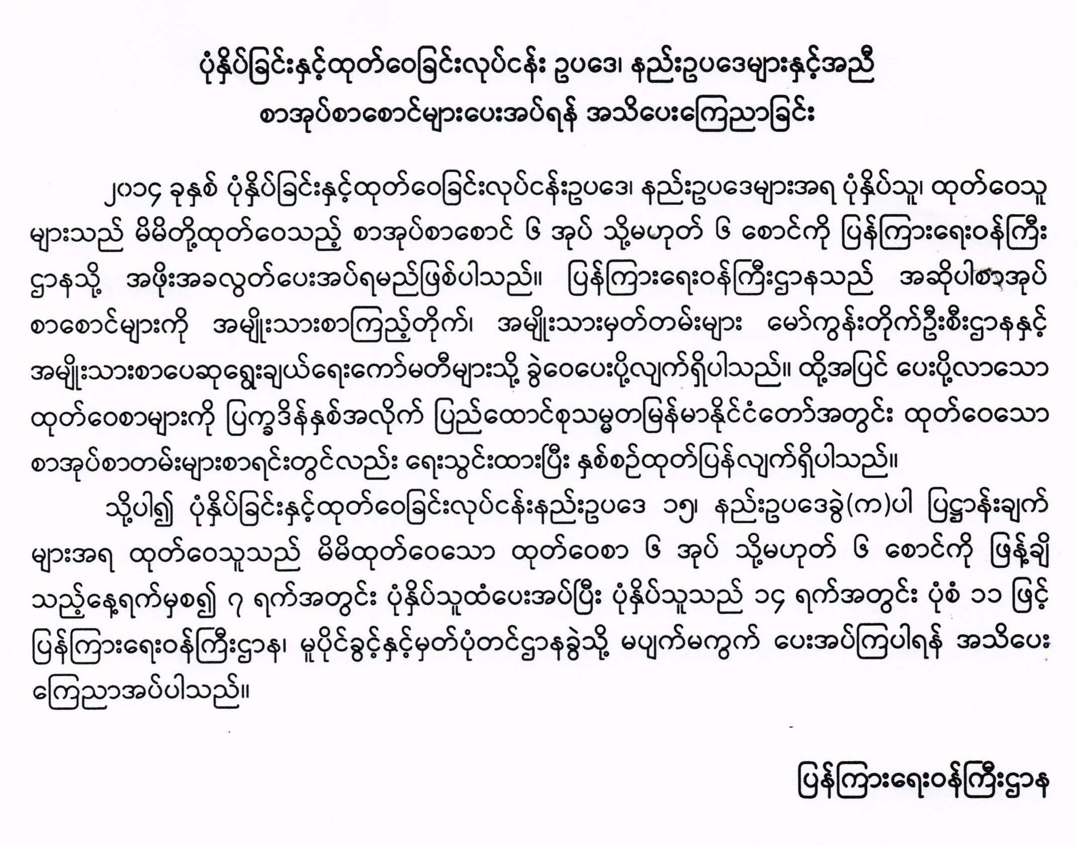 ပုံနှိပ်ခြင်းနှင့်ထုတ်ဝေခြင်းလုပ်ငန်း ဥပဒေ၊ နည်းဥပဒေများနှင့်အညီ စာအုပ်စာစောင်များပေးအပ်ရန် အသိပေးကြေညာခြင်း