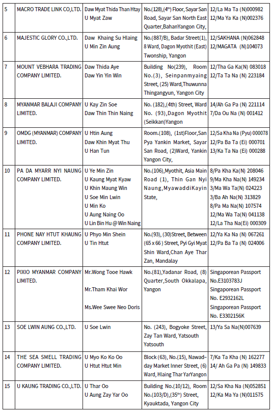 ၅။      ထပ်မံ၍ ကျန်ရှိသည့် ကုမ္ပဏီ(၁၉)ခု (ပူးတွဲစာရင်း)အား နိုင်ငံခြားသုံးငွေ စီမံခန့်ခွဲမှုဥပဒေပုဒ်မ ၄၂-က အရ အရေးယူဆောင်ရွက်လျက်ရှိပြီး ကုမ္ပဏီများနှင့် ပူးတွဲဖော်ပြထားသည့် ကုမ္ပဏီများ၏ ဒါရိုက်တာ အဖွဲ့ဝင်များအား အမည်မည်းစာရင်း ထည့်သွင်းကြောင်း ကြေညာပါသည်။ ကျန်ရှိနေသေးသည့် ပို့ကုန်ရငွေ ဝင်ရောက်ရန် ကျန်ကုမ္ပဏီများအားလည်း အရေးယူဆောင်ရွက်ရန် ဆက်လက်စိစစ်လျက်ရှိပါသည်။