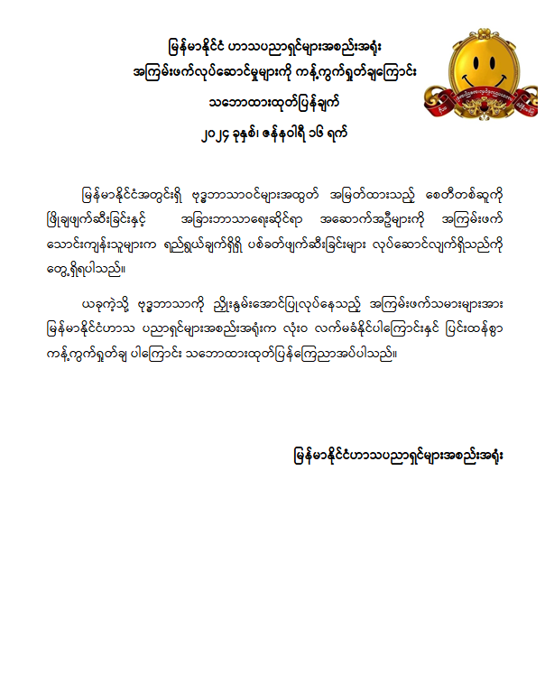 ယခုကဲ့သို့ ဗုဒ္ဓဘာသာကို ညှိုးနွမ်းအောင်ပြုလုပ်နေသည့် အကြမ်းဖက်သမားများအား မြန်မာနိုင်ငံဟာသ ပညာရှင်များအစည်းအရုံးက လုံးဝ လက်မခံနိုင်ပါကြောင်းနှင် ပြင်းထန်စွာ ကန့်ကွက်ရှုတ်ချ ပါကြောင်း သဘောထားထုတ်ပြန်ကြေညာအပ်ပါသည်။