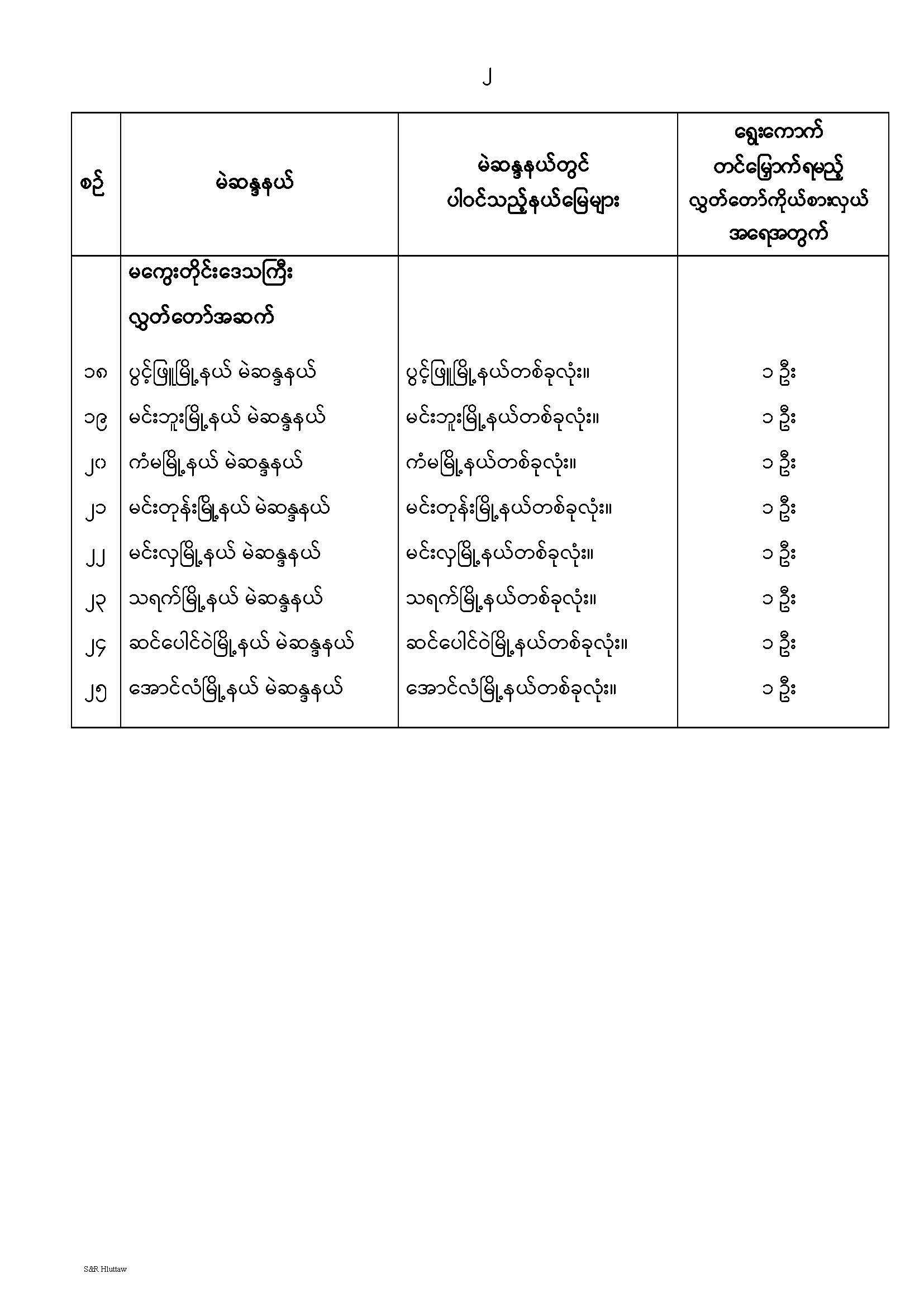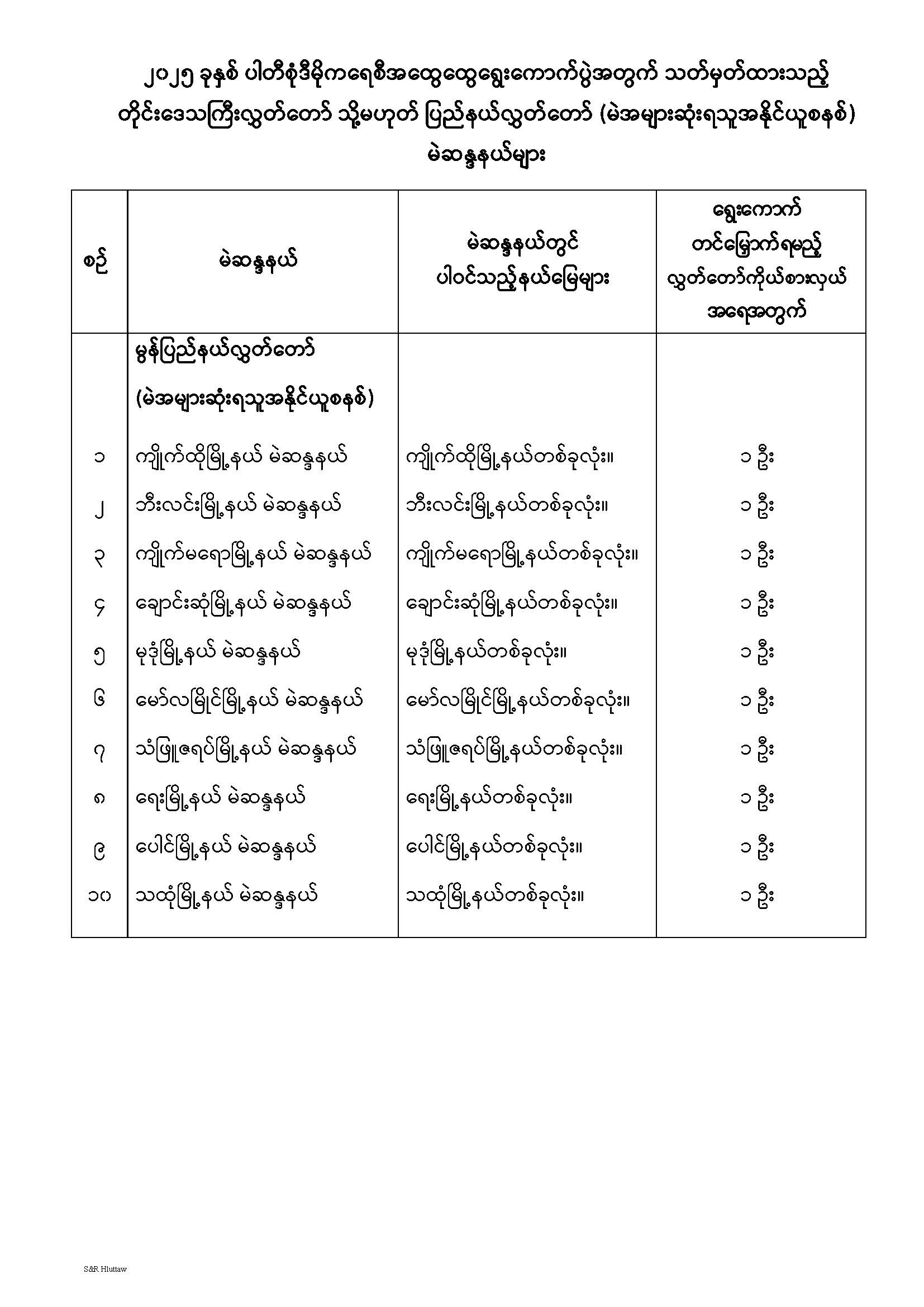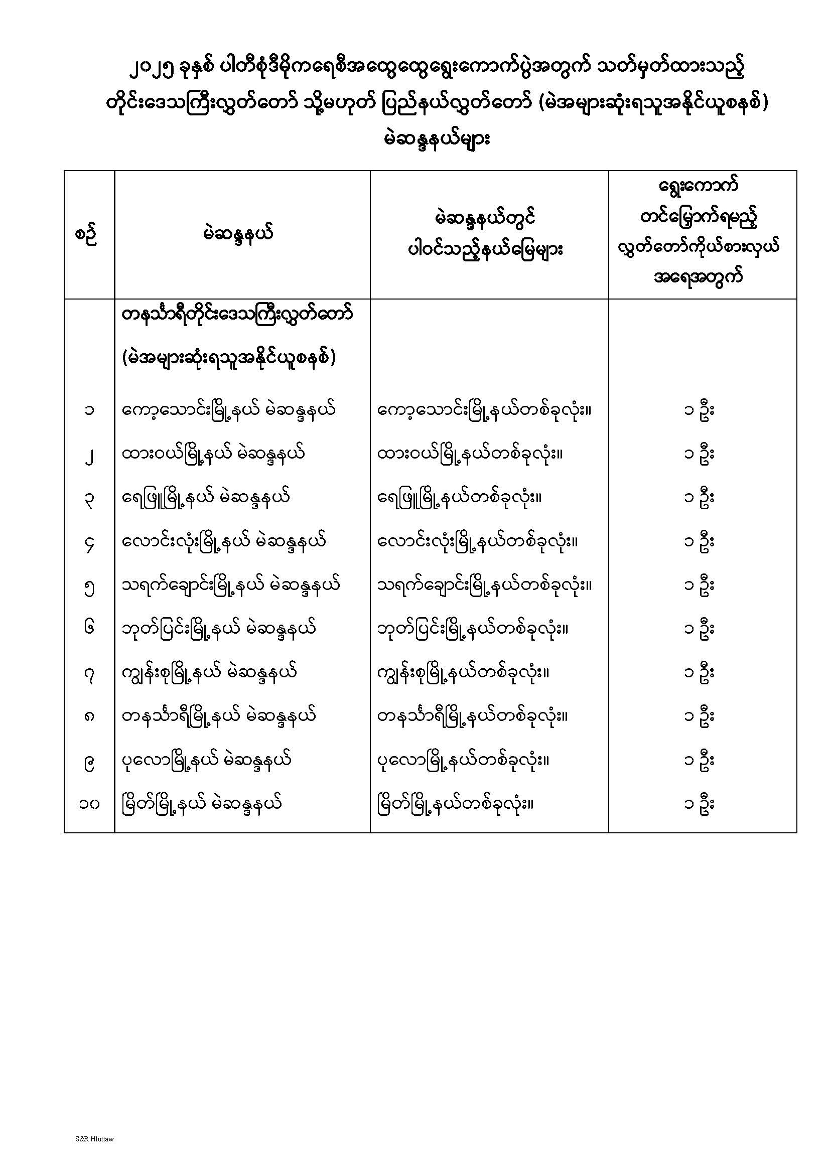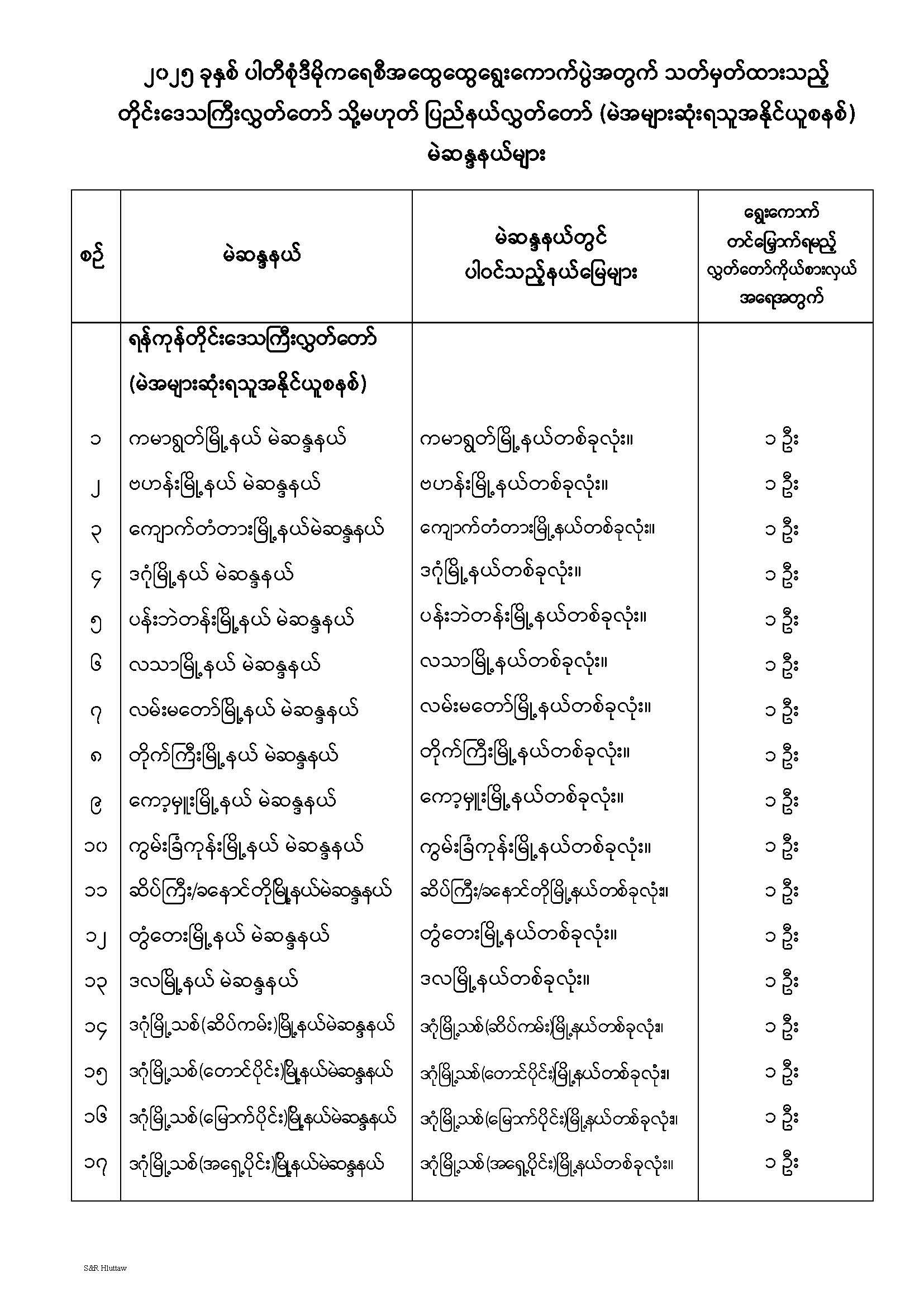 တိုင်းဒေသကြီးလွှတ်တော် သို့မဟုတ် ပြည်နယ်လွှတ်တော် မဲဆန္ဒနယ်များ သတ်မှတ်ကြေညာခြင်း