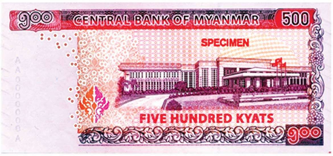 ဖြေ။ ။ ဗိုလ်ချုပ်ရုပ်ပုံပါ ကျပ် ၅၀၀ တန်ငွေစက္ကူသစ်ရဲ့ ကျောဘက်မှာပါတဲ့ အဆောက်အအုံပုံက နေပြည်တော်မှာရှိတဲ့ မြန်မာနိုင်ငံတော်ဗဟိုဘဏ်ရုံး အဆောက်အအုံပုံဖြစ်ပါတယ်။ ဗဟိုဘဏ် အဆောက်အအုံ ရှေ့မှာ နိုင်ငံတော်အလံကအလယ်၊ ဘေးနှစ်ဖက်က ဗဟို ဘဏ်အလံ ၂ ခု လွှင့်ထူ ထားခြင်းပဲဖြစ်ပါတယ်။