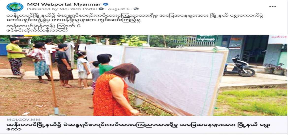 ထိုနည်းတူ တိုင်းဒေသကြီး၊ ပြည်နယ်၊ ခရိုင်၊ မြို့နယ် ပြန်ကြားရေးနှင့် ပြည်သူ့ဆက်ဆံရေး ဦးစီးဌာနရုံးများက Facebook Pages ၄၃၅ ခုတွင် မိမိတို့ ဒေသအလိုက်   ဆောင်ရွက်သည့်   ရွေးကောက်ပွဲဆိုင်ရာ   လှုပ်ရှားမှုများကို သတင်းရိုက်ကူးထုတ်လွှင့်မှု   ၆၂၉၀  နှင့်   MOI   Website၊   MRTV   နှင့် သတင်းစာတို့မှ ရွေးကောက်ပွဲဆိုင်ရာ ကြေညာချက်များကို ထပ်ဆင့်မျှဝေမှု ၂၆၇၆၂ ပုဒ်၊ စုစုပေါင်း ၃၃၀၅၂ ပုဒ်ကို ပြည်သူများသိရှိအောင် ဖော်ပြပေးခဲ့ပါသည်။ ထို့ပြင် ဒို့ကျေးရွာဂျာနယ်တွင် ရွေးကောက်ပွဲဆိုင်ရာ အသိအမြင် ဆောင်းပါး ၂၂ ပုဒ်ကို ရေးသားဖော်ပြပေး ခဲ့သည်။