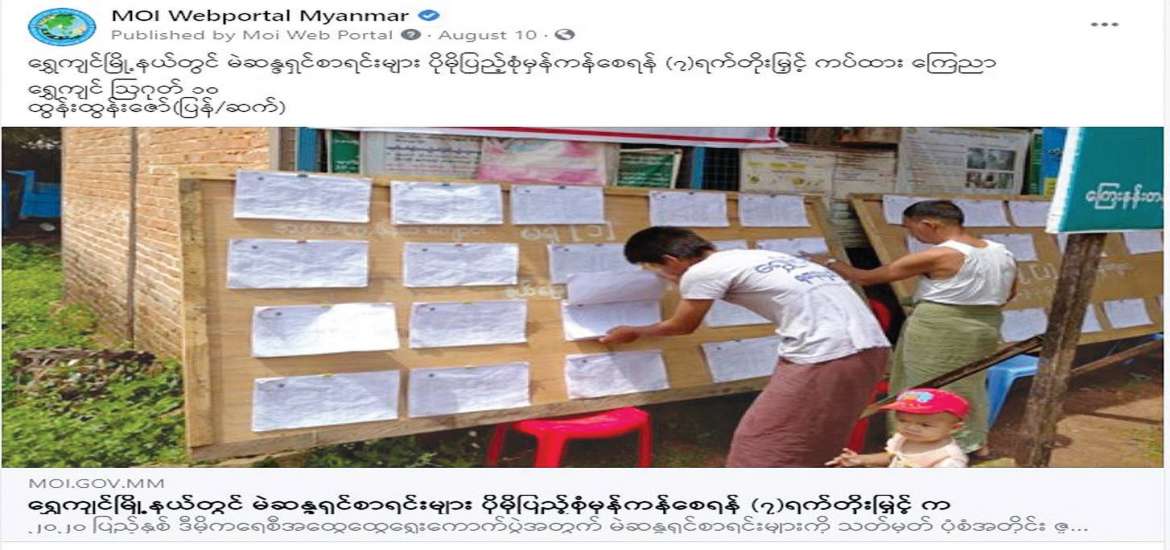 ထိုနည်းတူ တိုင်းဒေသကြီး၊ ပြည်နယ်၊ ခရိုင်၊ မြို့နယ် ပြန်ကြားရေးနှင့်     ပြည်သူ့ဆက်ဆံရေးဦးစီးဌာနရုံး Facebook Pages များတွင် မဲရေတွက်မှုနှင့် မဲရလဒ်များ ထုတ်ပြန်ခြင်းများနှင့်     ပတ်သက်သည့်သတင်းများ   စုစုပေါင်း ၆၅၅၉ ပုဒ်ကို လွှင့်တင် ပေးနိုင်ခဲ့ပါသည်။