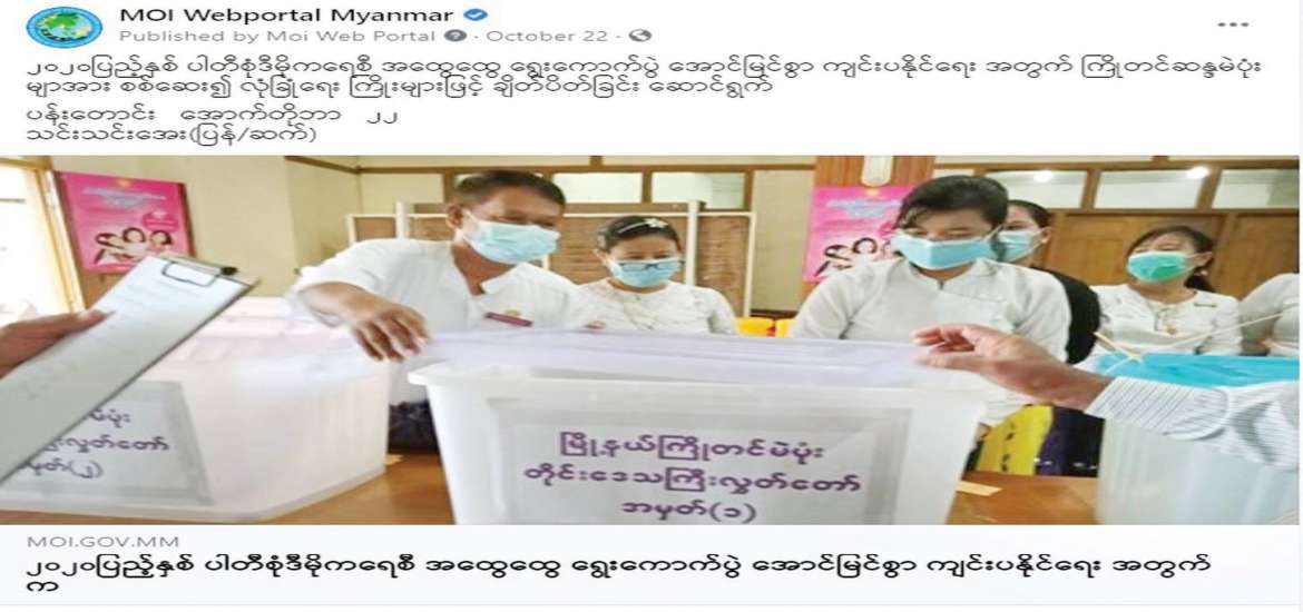 ရွေးကောက်ပွဲအကြိုကာလဖြစ်သည့် ၂၀၂၀ မေလမှ နိုဝင်ဘာ ၇ ရက် နေ့အထိ MOI Website နှင့် MOI Facebook Page တို့တွင် တိုင်းဒေသကြီး၊ ပြည်နယ်၊ ခရိုင်၊ မြို့နယ်များက ဆောင်ရွက်နေသည့် ရွေးကောက်ပွဲဆိုင်ရာ လှုပ်ရှားဆောင်ရွက်မှု သတင်း ၃၃၀၇ ပုဒ်၊ သတင်းဗီဒီယို ၁၁၇၀ ၊ MRTV နှင့် သတင်းစာများက ဖော်ပြသည့် သတင်းများကို ထပ်ဆင့်ဖော်ပြသည့်သတင်း ၁၁၈ ပုဒ်၊ ပြည်ထောင်စုရွေးကောက်ပွဲကော်မရှင်က ထုတ်ပြန်ကြေညာချက် ၃၇ပုဒ်၊ စုစုပေါင်း ၄၆၃၂ ပုဒ်ကို ပြည်သူများ သိရှိစေရန် ဖော်ပြပေးခဲ့ပါသည်။