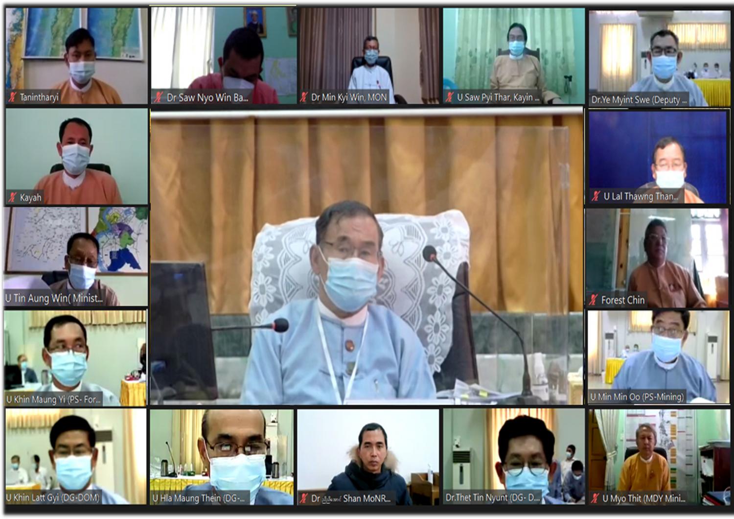 သယံဇာတနှင့်သဘာဝပတ်ဝန်းကျင် ထိန်းသိမ်းရေးဝန်ကြီးဌာ၏၂၀၂၀-၂၀၂၁ဘဏ္ဍာနှစ် (ပထမအ ကြိမ်) လေးလပတ်လုပ်ငန်းညှိနှိုင်းအစည်းအဝေးကို ယနေ့နံနက် ၉ နာရီခွဲတွင် နေပြည်တော်ရှိ၊ အဆိုပါ ဝန်ကြီး ဌာန သီရိရတနာခန်းမ၌ Coronavirus Disease 2019 (COVID-19) ကာကွယ်၊ ထိန်းချုပ်၊ ကုသရေး အမျိုးသားအဆင့်ဗဟိုကော်မတီ၏ လမ်းညွှန်ချက်၊ ကျန်းမာရေးနှင့်အားကစားဝန်ကြီးဌာနမှ ထုတ်ပြန် ထားသည့် ညွှန်ကြားချက်များနှင့်အညီ Virtual Online ဖြင့်ကျင်းပသည်။