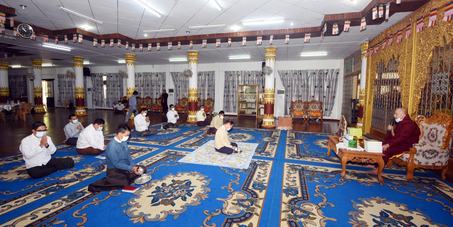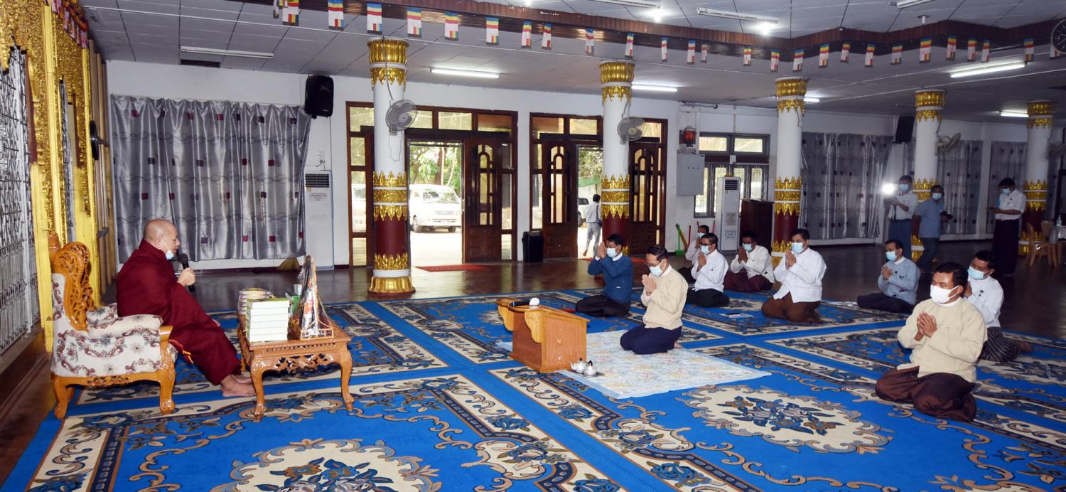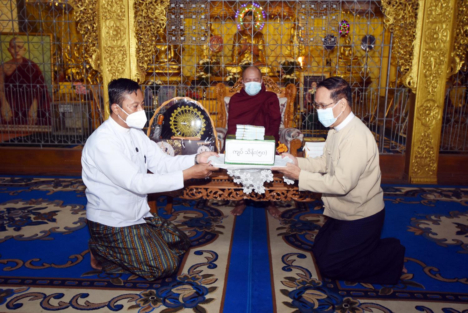 ထို့နောက် ပြည်ထောင်စုဝန်ကြီးက ထေရဝါဒဗုဒ္ဓသာသနာတော် တည်တံ့ပြန့်ပွား ရေး အတွက် ကြိုးပမ်းဆောင်ရွက်သွားမည်ဖြစ်ပါကြောင်း၊ ဆရာတော်ကြီးများက ဓမ္မာနုဂ္ဂဟ ဖြင့် ဆောင်ရွက်သကဲ့သို့ ဒါယကာများမှလည်း ပစ္စယာနုဂ္ဂဟဖြင့် ထောက်ပံ့လှူဒါန်းရေးဆောင် ရွက်သွားမည်ဖြစ်ပါကြောင်း၊ နိုင်ငံတော်စီမံအုပ်ချုပ်ရေး ကောင်စီ နိုင်ငံတော် တာဝန်ယူပြီး ရွှေတိဂုံစေတီတော်မြတ်ကြီးနှင့် တစ်နိုင်ငံလုံးရှိ ဘုရား၊ စေတီ၊ ပုထိုးများကို ဖေဖော်ဝါရီ ၈ ရက် တွင် တစ်နိုင်ငံလုံး၌ ပြည်သူများဖူးမျှော် ကြည်ညိုနိုင် ရန် ဆောင်ရွက်ခဲ့ကြောင်း၊ အကြိမ် (၆၀) မြောက် မဟာဘွဲ့နှင်းသဘင်အခမ်းအနားနှင့် အဋ္ဌမ အကြိမ် နိုင်ငံတော် သံဃမဟာနာယ က အဖွဲ့ (၄၇) ပါးစုံညီ ဆဋ္ဌမအစည်းအဝေးနှင့် သတ္တမ အစည်းအဝေးကို အောင်မြင်စွာ ကျင်းပပြီး စီးခဲ့ပါကြောင်း၊ သာသနာတော်ဆိုင်ရာ ဘွဲ့တံဆိပ်တော်များ လှူဒါန်းဆက်ကပ်ပွဲ အခမ်းအနား ကို တပေါင်းလပြည့်နေ့ မတ် (၂၇)ရက်တွင် ကျင်းပသွားမည်ဖြစ်ကြောင်း၊ ဘုန်းတော်ကြီး သင်ပညာရေးကျောင်းများကို အထူးအလေး ထား ထောက်ပံ့ ဆောင်ရွက်သွား မည်ဖြစ်ကြောင်း သာသနာရေးဆိုင်ရာများ လျှောက်ထား သည်။