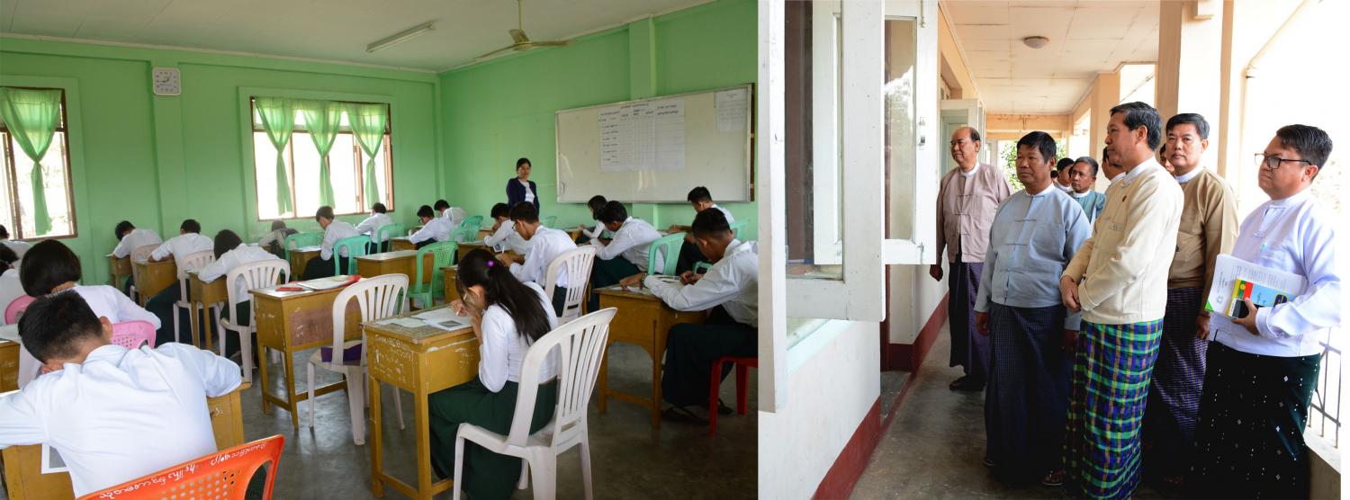 ဌာန၌ ကျောင်းသူကျောင်းသားများ မြန်မာစာဘာသာ ဖြေဆိုနေမှုများနှင့် စာမေးပွဲဆိုင်ရာ လုပ်ငန်းဆောင်ရွက်နေမှုများကို ပညာရေး၀န်ကြီးဌာန ပြည်ထောင်စု၀န်ကြီး ဒေါက်တာ မျိုးသိမ်းကြီး၊ ဒုတိယဝန်ကြီး ဦးဝင်းမော်ထွန်းနှင့် နေပြည်တော်ကောင်စီဝင် ဦးတင်ထွန်းတို့က လှည့်လည်ကြည့်ရှု အားပေးကြသည်။
