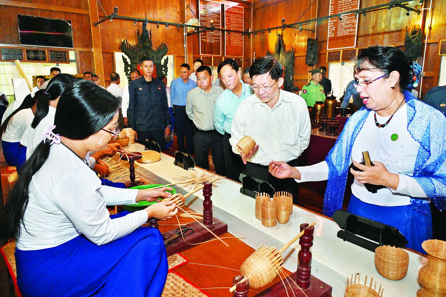 ဆက်လက်၍ နိုင်ငံတော်စီမံအုပ်ချုပ်ရေးကောင်စီဥက္ကဋ္ဌ နိုင်ငံတော်ဝန်ကြီးချုပ်နှင့် အဖွဲ့ဝင် များသည် ယွန်းနည်းစဉ်ခန်းမအတွင်း သင်တန်းသား၊ သင်တန်းသူများ၏ ဝါး၊ အနက်ထည်၊ ကညစ်၊ ရွှေဇဝါ ယွန်း၊ သားရိုးပန်းကြွ စသည်ဖြင့် ယွန်းနည်းစဉ်အဆင့်ဆင့်အား လက်တွေ့ဆောင်ရွက်နေမှုများကိုလှည့်လည်ကြည့်ရှုလေ့လာရာ တာဝန်ရှိသူများက ရှင်းလင်းတင်ပြကြသည်။