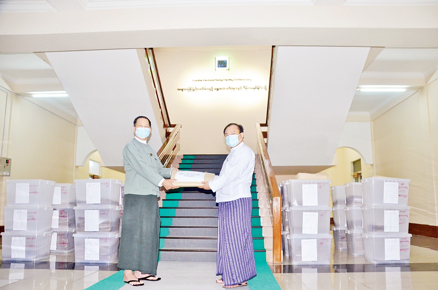 ဆက်လက်စိစစ်ပြီးသည့် ဆန္ဒမဲပေးပိုင်ခွင့်ရှိသူ ၂၀၄၂၆ ဦးအတွက် ကြိုတင်ဆန္ဒမဲလက်မှတ်နှင့် စာအိတ် များကို ပြည်ထောင်စုရွေးကောက်ပွဲကော်မရှင်ရုံး ညွှန်ကြားရေးမှူးချုပ် ဦးခင်မောင်ဦးက နိုင်ငံခြားရေးဝန်ကြီးဌာန၊ စီမံကိန်းနှင့် စီမံရေးရာဦးစီးဌာန ညွှန်ကြားရေး မှူးချုပ် ဦးအောင်စိုးဝင်းထံသို့ ယနေ့တွင် ဒုတိယအကြိမ်အဖြစ် လွှဲပြောင်းပေးအပ်သည်။