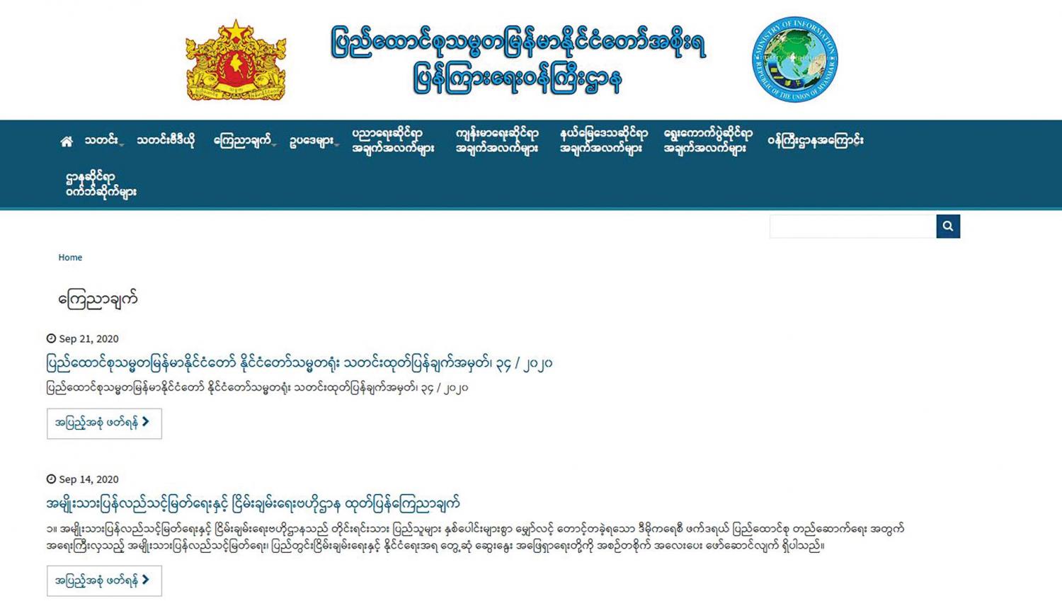 ဝက်ဘ်ဆိုက်ကို လေ့လာကြည့်တဲ့အခါ နိုင်ငံတော် အစိုးရရဲ့ သတင်းထုတ်ပြန်ချက်၊ နိုင်ငံတော်အကြီးအကဲ တွေရဲ့ လှုပ်ရှားဆောင်ရွက်မှု၊ မိန့်ခွန်းတွေနဲ့ အများပြည်သူ သိသင့်သိထိုက်တဲ့ အချက်အလက်တွေ အားလုံး၊ လတ်တလော သတင်းထုတ်ပြန်ထားချက်တွေနဲ့ ဒေသ ဆိုင်ရာသတင်းတွေကို အဓိကထား လွှင့်တင်နေတာကို တွေ့မြင်ရပါတယ်။ ဒါကြောင့် လတ်တလောအရေးပေါ် ဖြစ်ပေါ်နေတဲ့ ကိုဗစ်-၁၉ သတင်းတွေ၊ ရွေးကောက်ပွဲဆိုင်ရာ အချက်အလက်တွေ၊ ပညာရေးဆိုင်ရာအချက်အလက် တွေကို ရယူနိုင်ဖို့အတွက် ကူညီနိုင်တဲ့ ဝက်ဘ်ဆိုက်တစ်ခု လည်း ဖြစ်ပါတယ်။