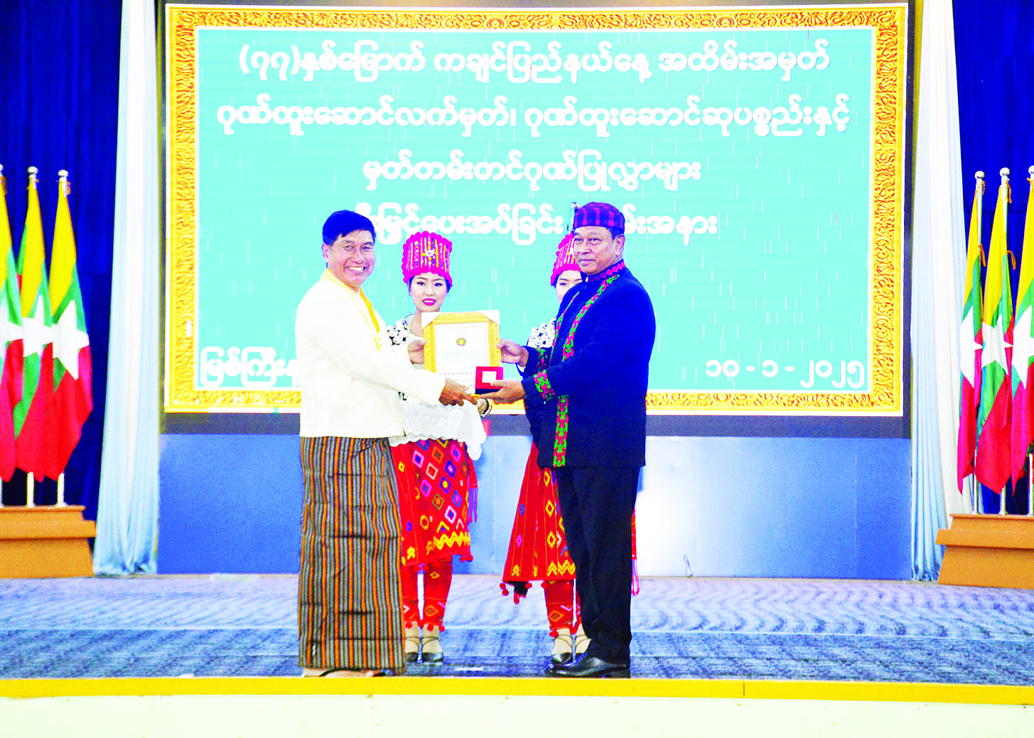 ဆက်လက်၍ ဂုဏ်ထူးဆောင်လက်မှတ်နှင့် ဂုဏ်ထူးဆောင် ဆုပစ္စည်းပေးအပ်ချီးမြှင့်ရာ ဒုတိယဝန်ကြီးချုပ်နှင့် ပြည်ထောင်စုဝန်ကြီး ဗိုလ်ချုပ်ကြီးတင်အောင်စန်းက စီမံထူးချွန်ဆု (ပထမအဆင့်) ရရှိသူများကို လည်းကောင်း၊ နိုင်ငံတော်စီမံအုပ်ချုပ်ရေးကောင်စီအဖွဲ့ဝင် ဒေါ်ဒွဲဘူက စီးပွားထူးချွန်ဆုနှင့် လူမှုထူးချွန်ဆု (ပထမအဆင့်) ရရှိသူများကို လည်းကောင်း၊ ပြည်နယ်ဝန်ကြီးချုပ်က စီမံထူးချွန်ဆု၊ စီးပွားထူးချွန်ဆုနှင့် လူမှုထူးချွန်ဆု (ဒုတိယအဆင့်နှင့် တတိယအဆင့်) ရရှိသူများကို လည်းကောင်း ဂုဏ်ထူးဆောင် လက်မှတ်နှင့်ဂုဏ်ထူးဆောင်ဆု ပစ္စည်းများကို ပေးအပ်ချီးမြှင့်ကြပြီး ဆုရရှိသူများနှင့် စုပေါင်း မှတ်တမ်းတင်ဓာတ်ပုံရိုက်ကြသည်။
